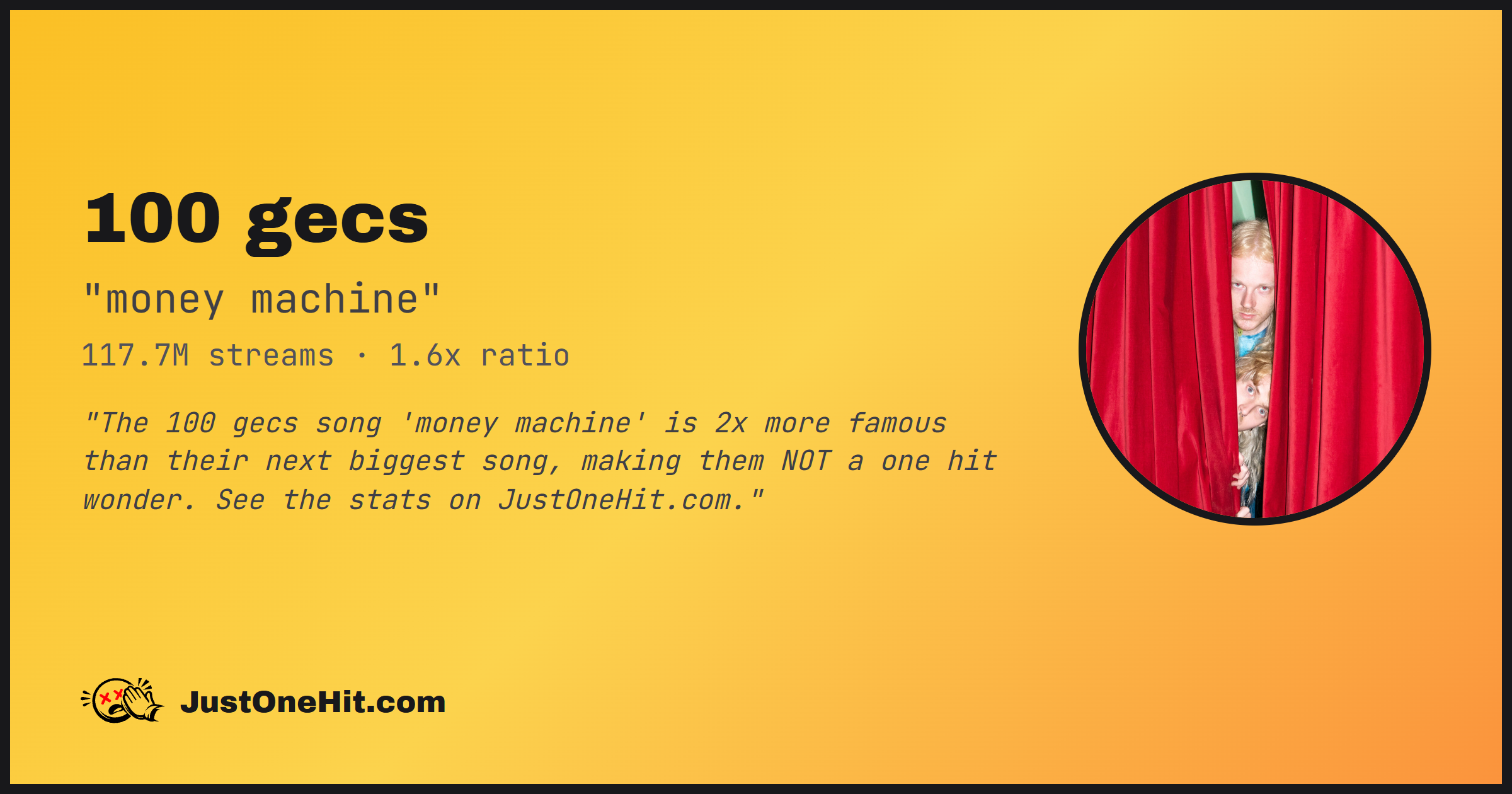 "The 100 gecs song 'money machine' is 2x more famous than their next biggest song, making them NOT a one hit wonder. See the stats on JustOneHit.com."