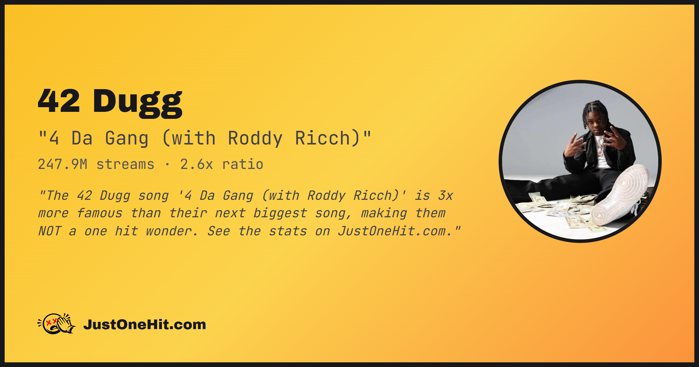 "The 42 Dugg song '4 Da Gang (with Roddy Ricch)' is 3x more famous than their next biggest song, making them NOT a one hit wonder. See the stats on JustOneHit.com."