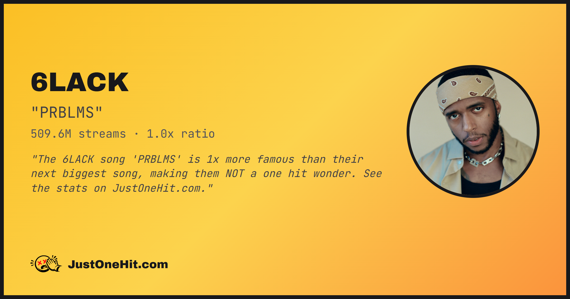 "The 6LACK song 'PRBLMS' is 1x more famous than their next biggest song, making them NOT a one hit wonder. See the stats on JustOneHit.com."