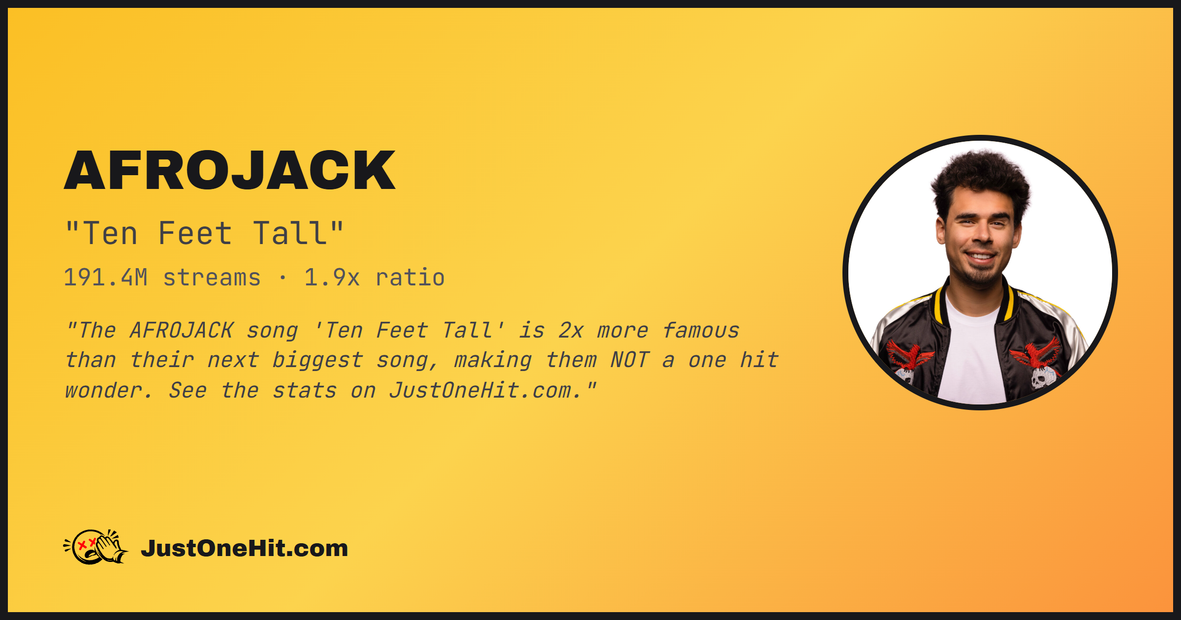 "The AFROJACK song 'Ten Feet Tall' is 2x more famous than their next biggest song, making them NOT a one hit wonder. See the stats on JustOneHit.com."