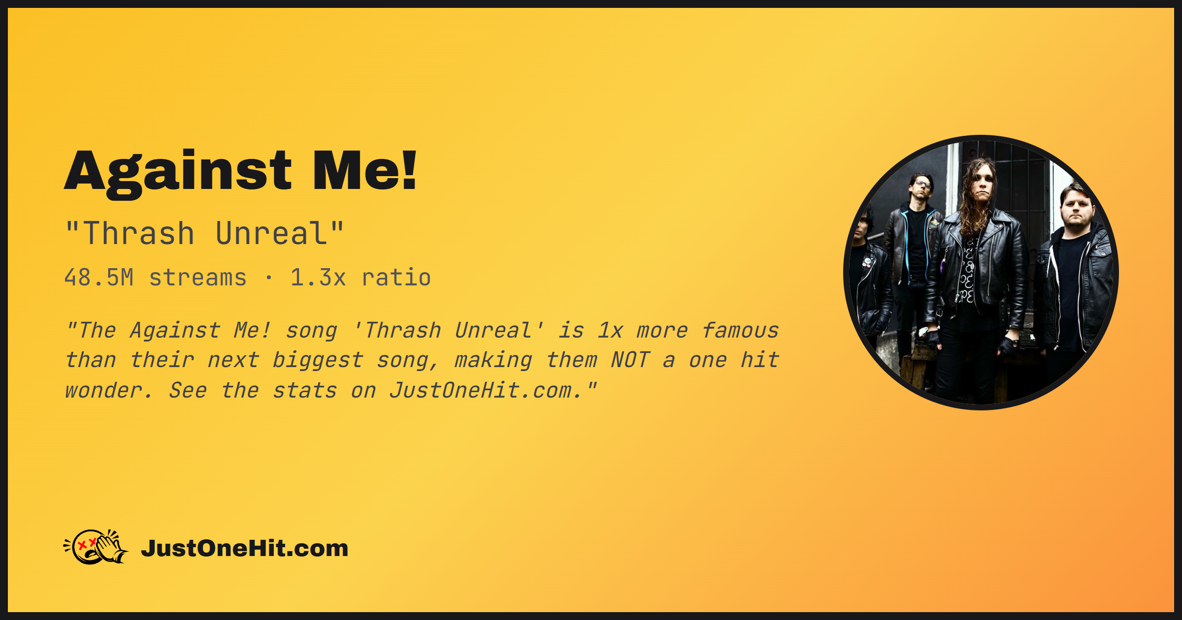 "The Against Me! song 'Thrash Unreal' is 1x more famous than their next biggest song, making them NOT a one hit wonder. See the stats on JustOneHit.com."