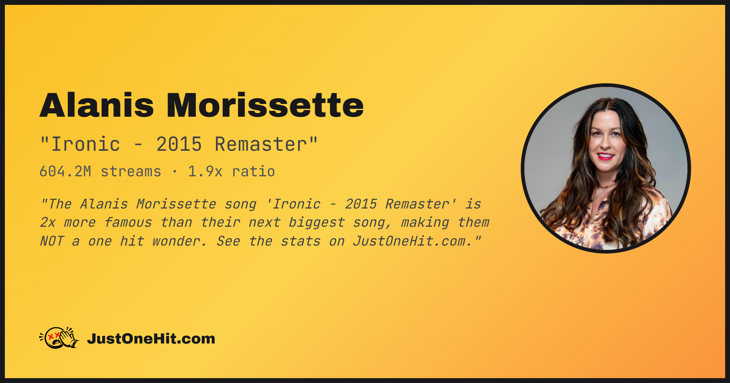 "The Alanis Morissette song 'Ironic - 2015 Remaster' is 2x more famous than their next biggest song, making them NOT a one hit wonder. See the stats on JustOneHit.com."