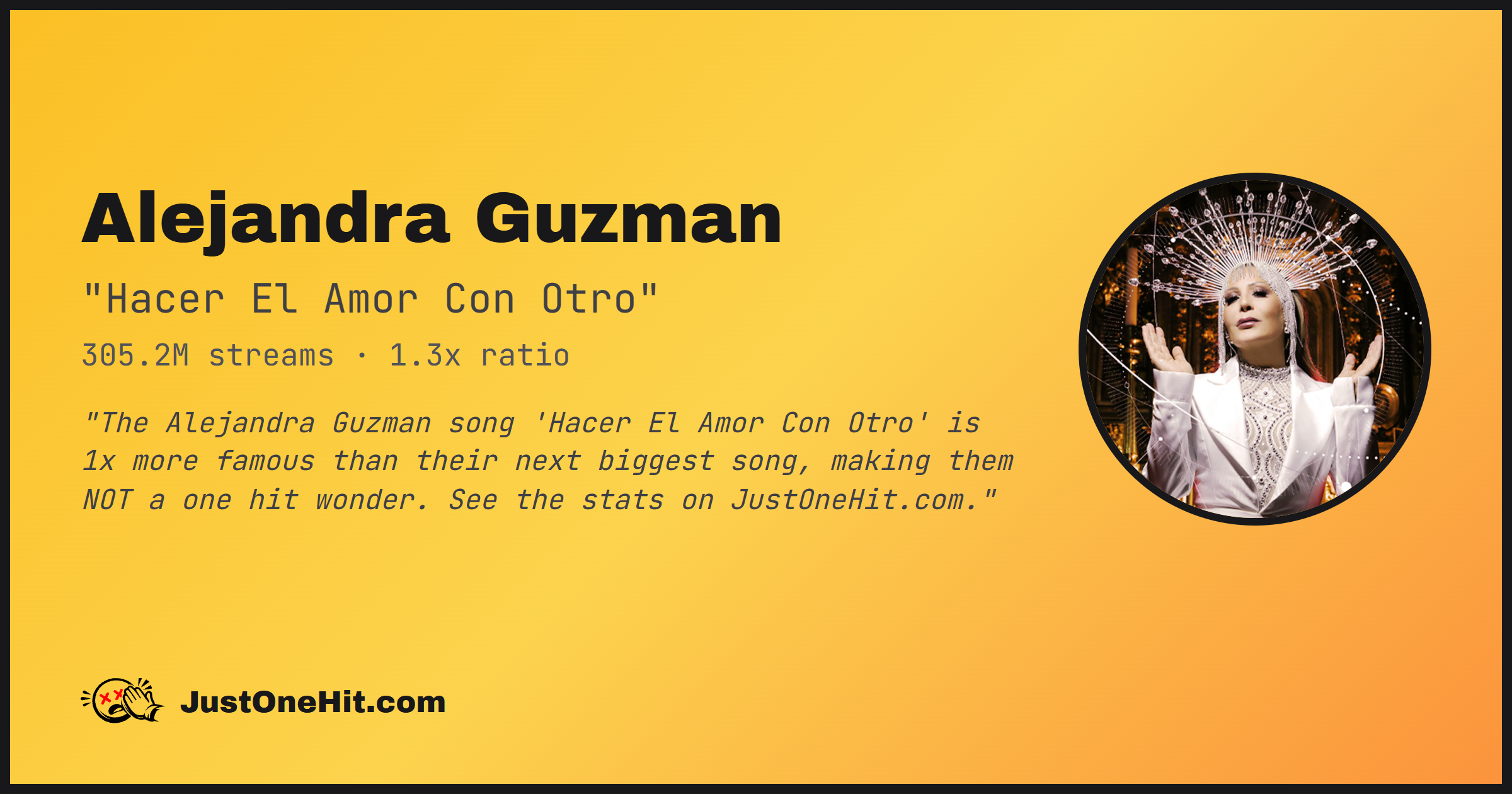"The Alejandra Guzman song 'Hacer El Amor Con Otro' is 1x more famous than their next biggest song, making them NOT a one hit wonder. See the stats on JustOneHit.com."