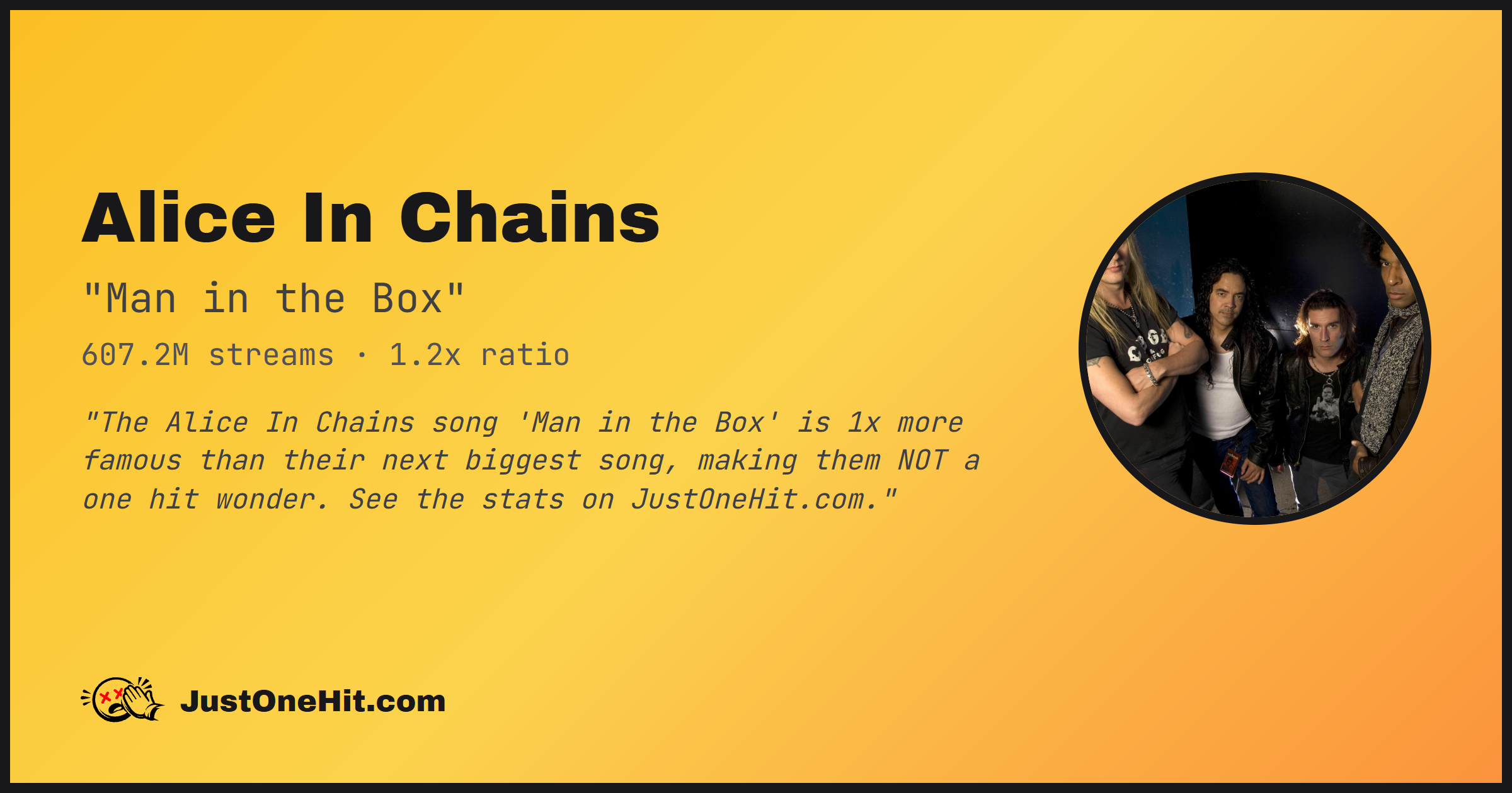 "The Alice In Chains song 'Man in the Box' is 1x more famous than their next biggest song, making them NOT a one hit wonder. See the stats on JustOneHit.com."