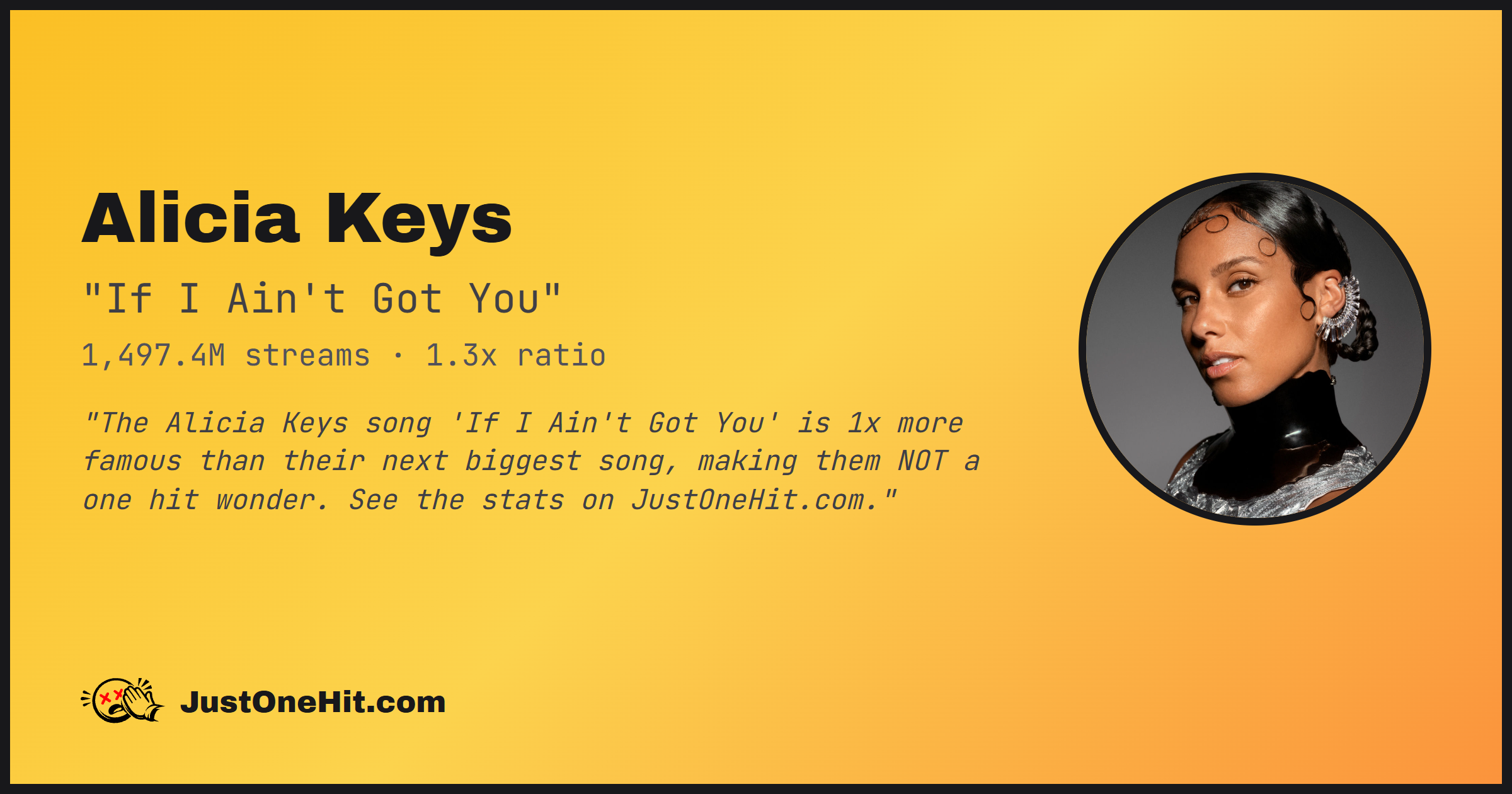 "The Alicia Keys song 'If I Ain't Got You' is 1x more famous than their next biggest song, making them NOT a one hit wonder. See the stats on JustOneHit.com."