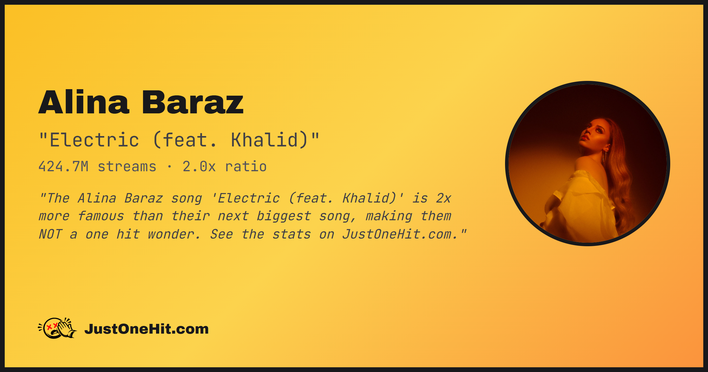 "The Alina Baraz song 'Electric (feat. Khalid)' is 2x more famous than their next biggest song, making them NOT a one hit wonder. See the stats on JustOneHit.com."