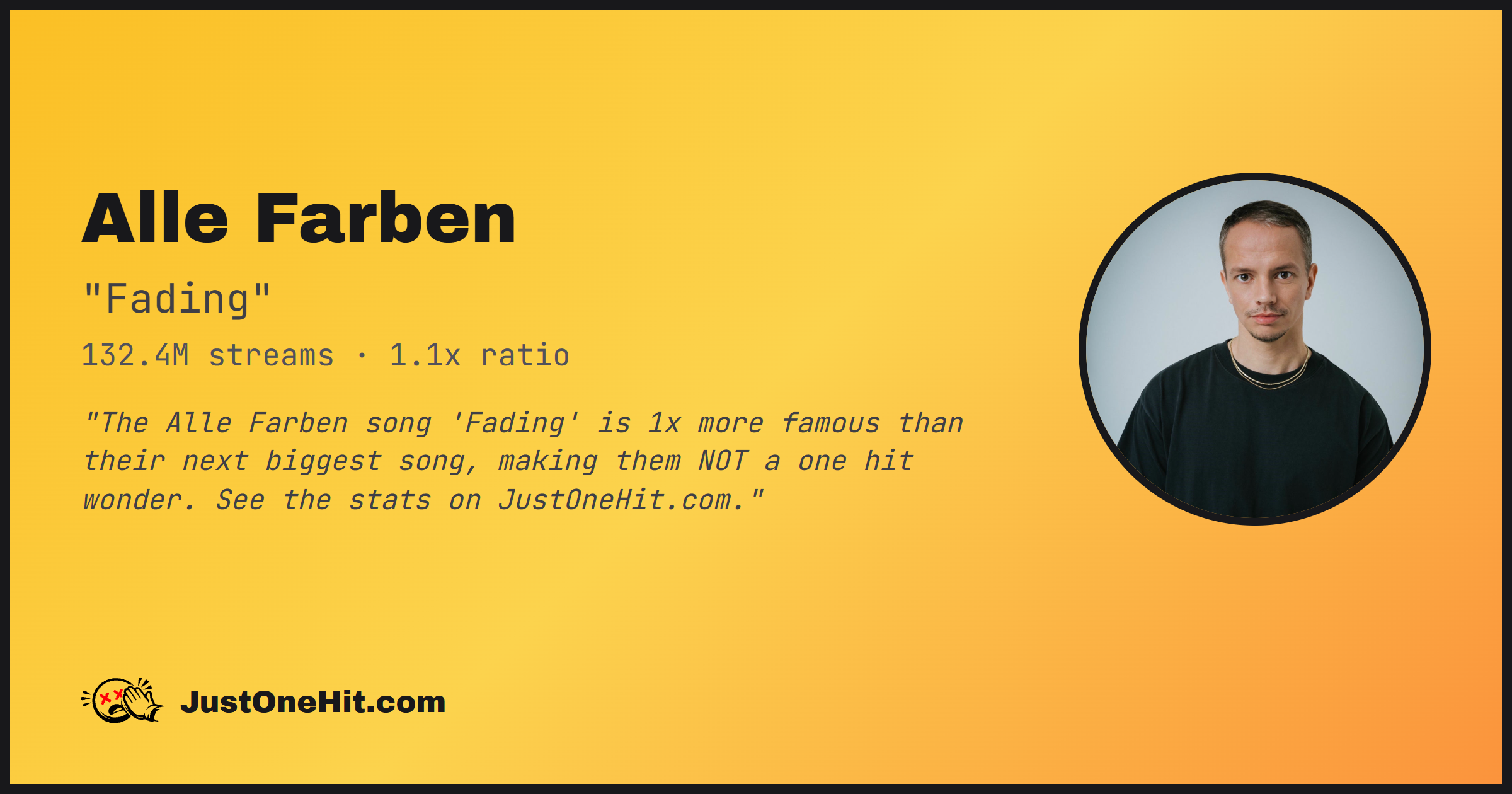 "The Alle Farben song 'Fading' is 1x more famous than their next biggest song, making them NOT a one hit wonder. See the stats on JustOneHit.com."