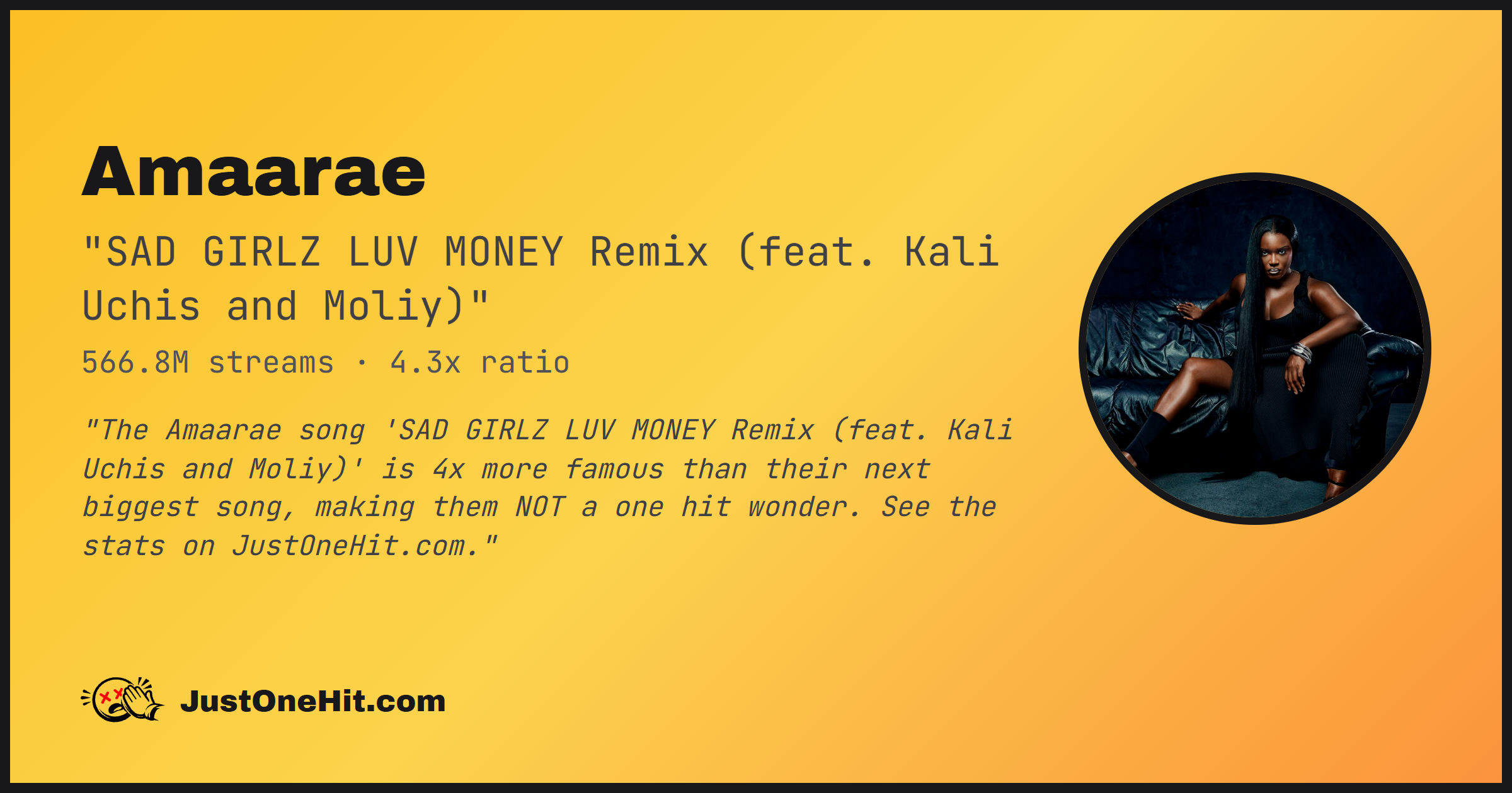 "The Amaarae song 'SAD GIRLZ LUV MONEY Remix (feat. Kali Uchis and Moliy)' is 4x more famous than their next biggest song, making them NOT a one hit wonder. See the stats on JustOneHit.com."