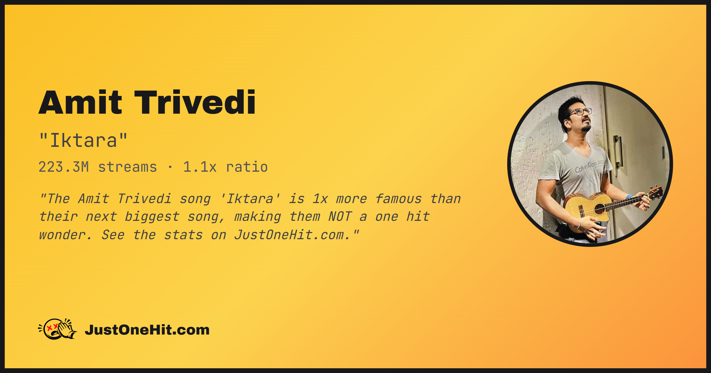 "The Amit Trivedi song 'Iktara' is 1x more famous than their next biggest song, making them NOT a one hit wonder. See the stats on JustOneHit.com."