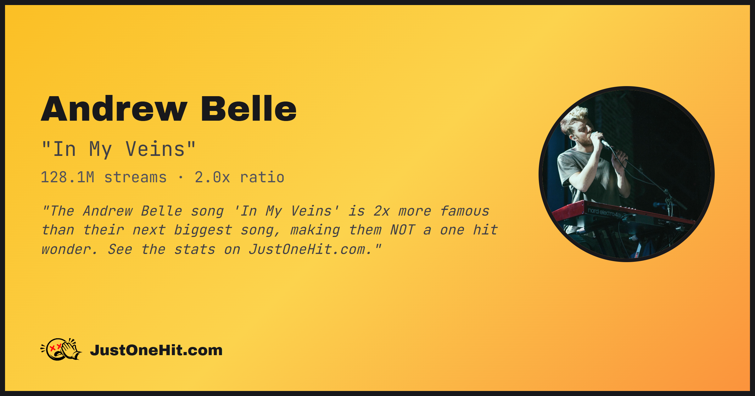 "The Andrew Belle song 'In My Veins' is 2x more famous than their next biggest song, making them NOT a one hit wonder. See the stats on JustOneHit.com."