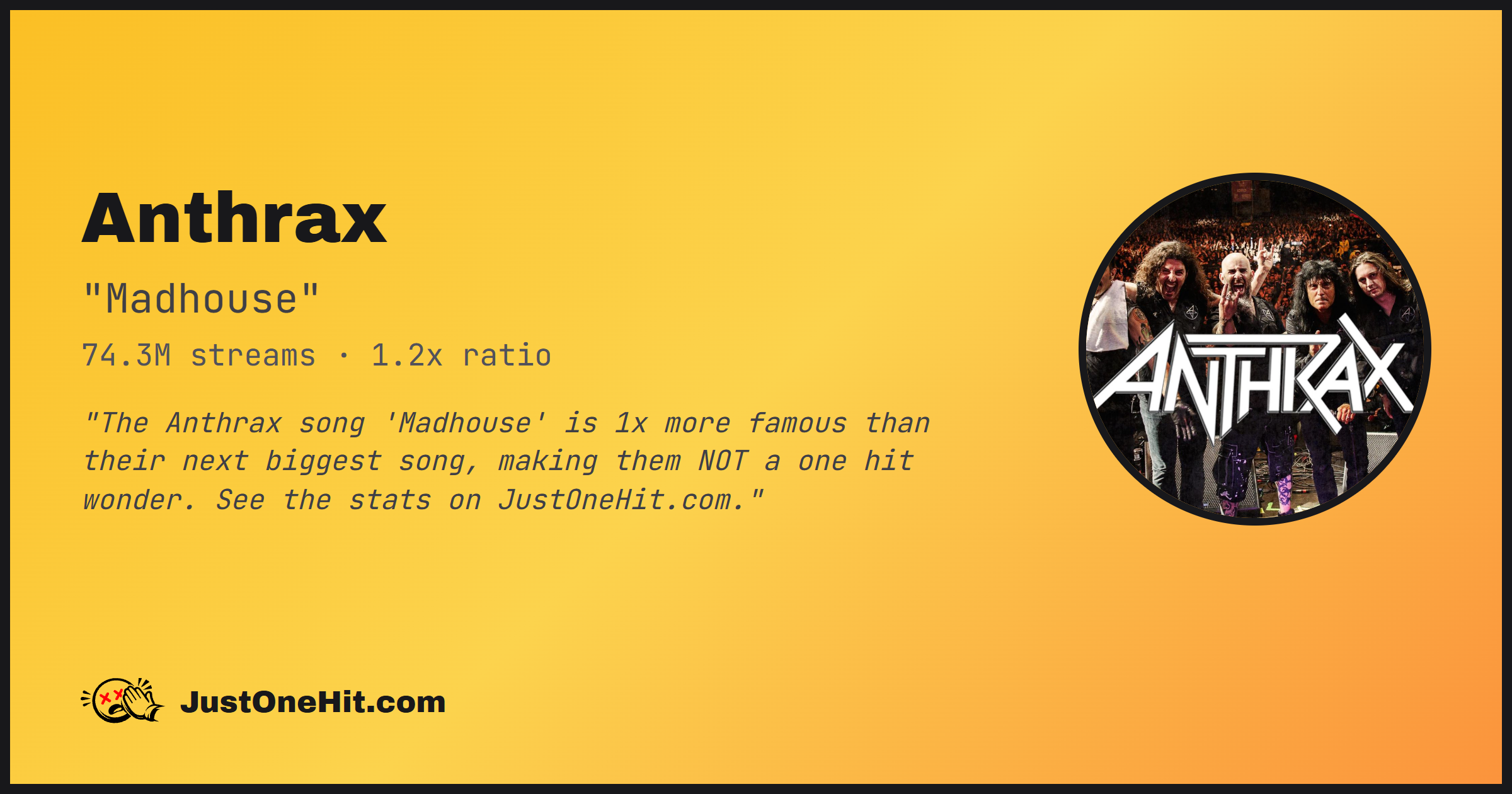 "The Anthrax song 'Madhouse' is 1x more famous than their next biggest song, making them NOT a one hit wonder. See the stats on JustOneHit.com."