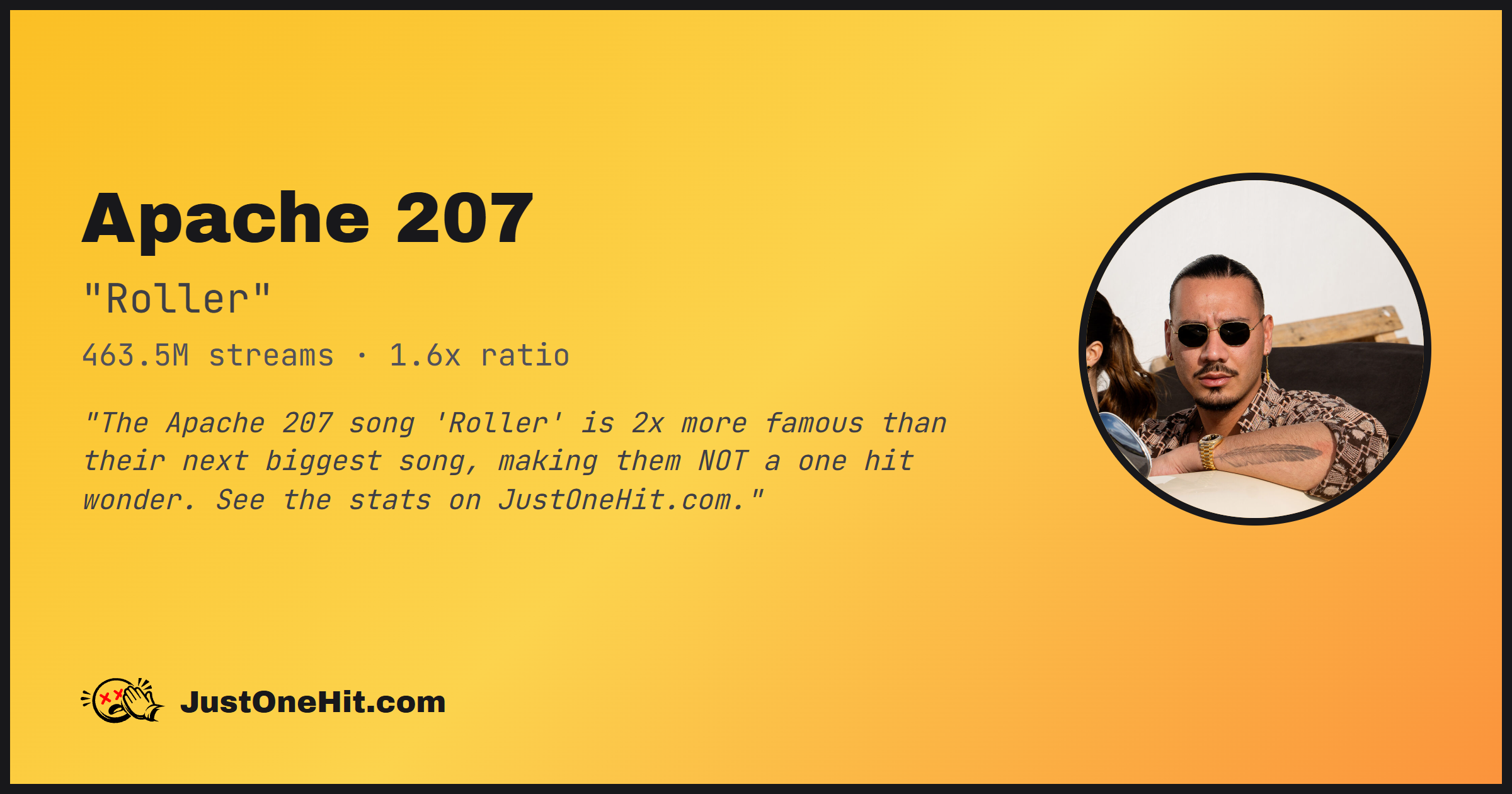 "The Apache 207 song 'Roller' is 2x more famous than their next biggest song, making them NOT a one hit wonder. See the stats on JustOneHit.com."