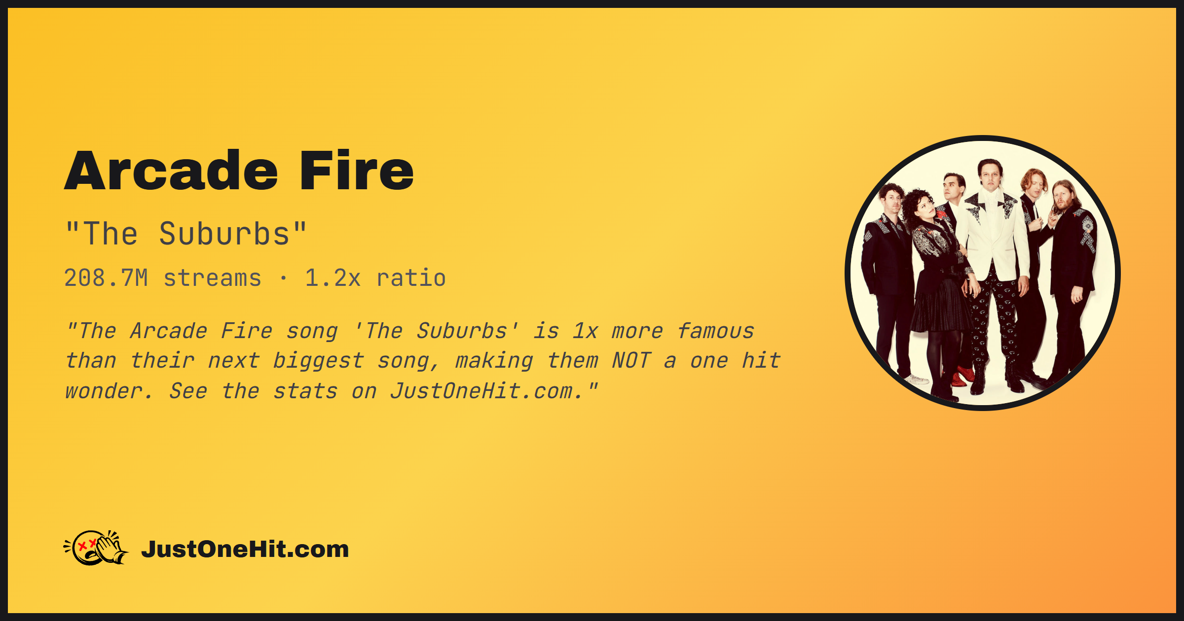 "The Arcade Fire song 'The Suburbs' is 1x more famous than their next biggest song, making them NOT a one hit wonder. See the stats on JustOneHit.com."