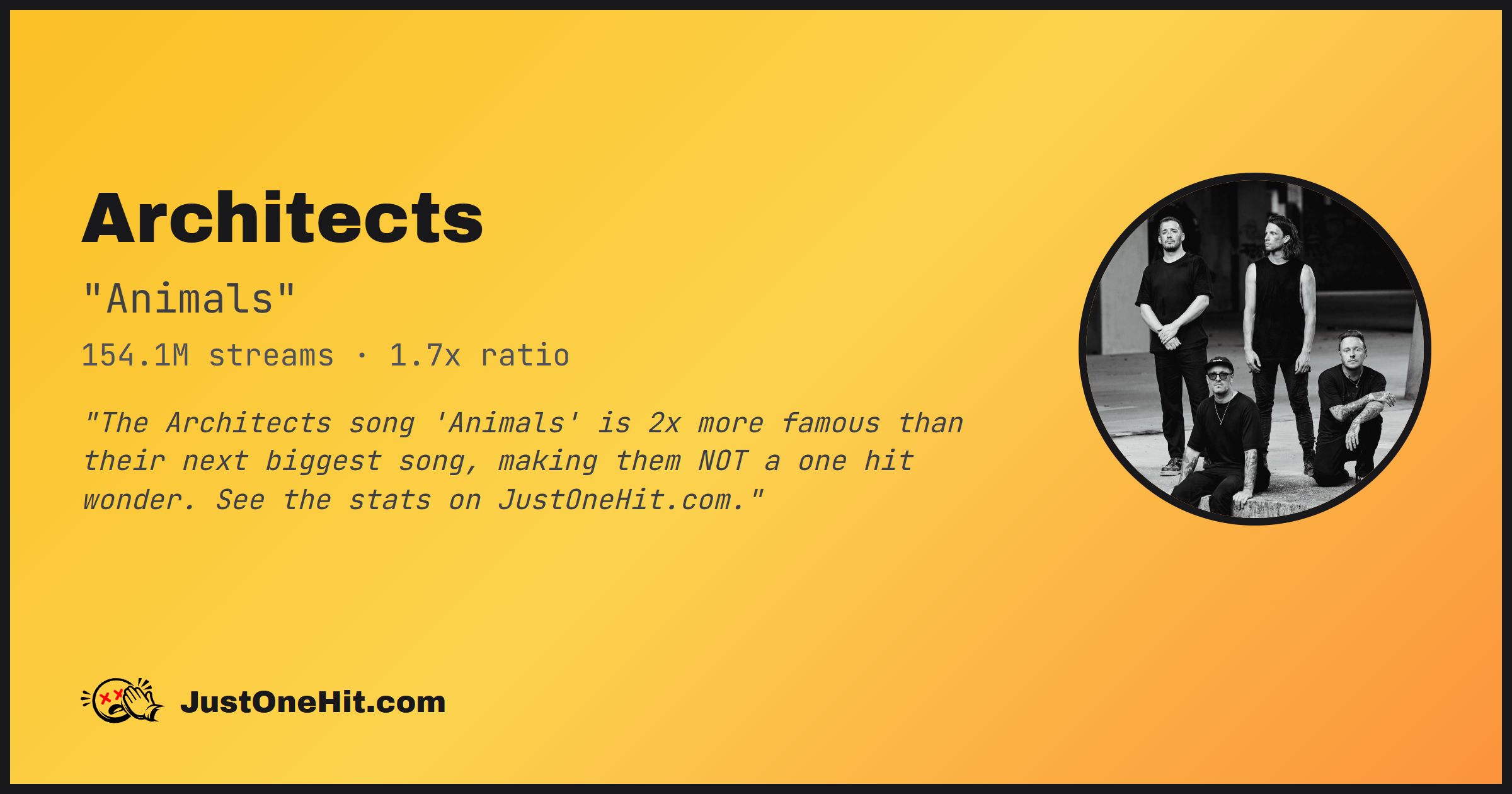 "The Architects song 'Animals' is 2x more famous than their next biggest song, making them NOT a one hit wonder. See the stats on JustOneHit.com."