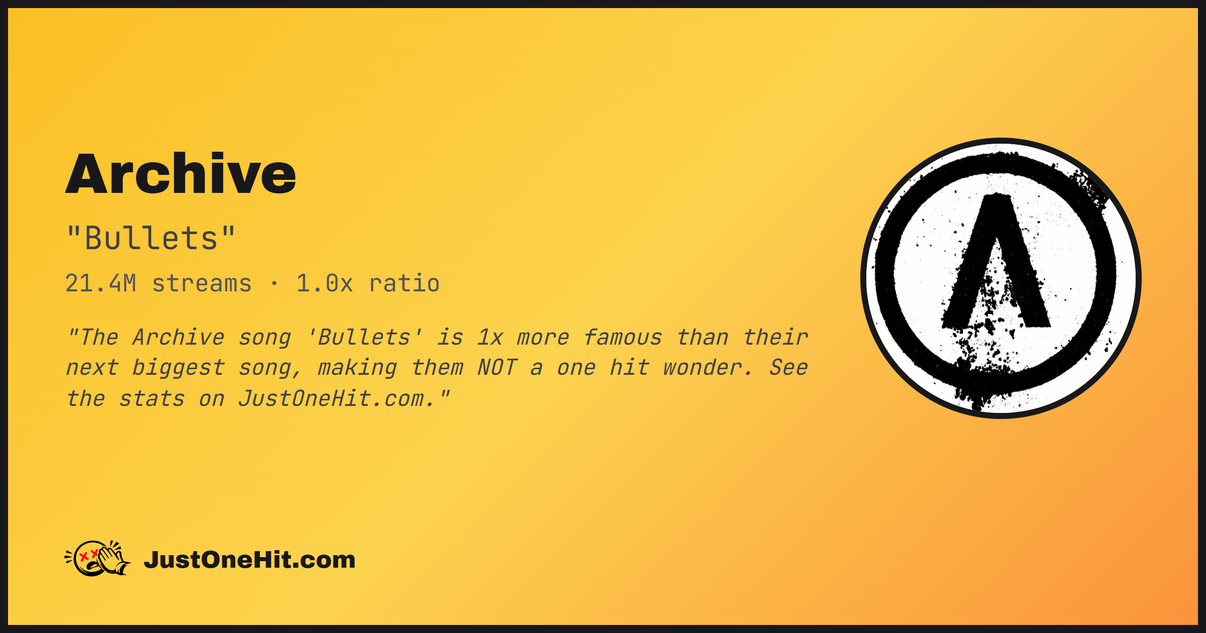 "The Archive song 'Bullets' is 1x more famous than their next biggest song, making them NOT a one hit wonder. See the stats on JustOneHit.com."