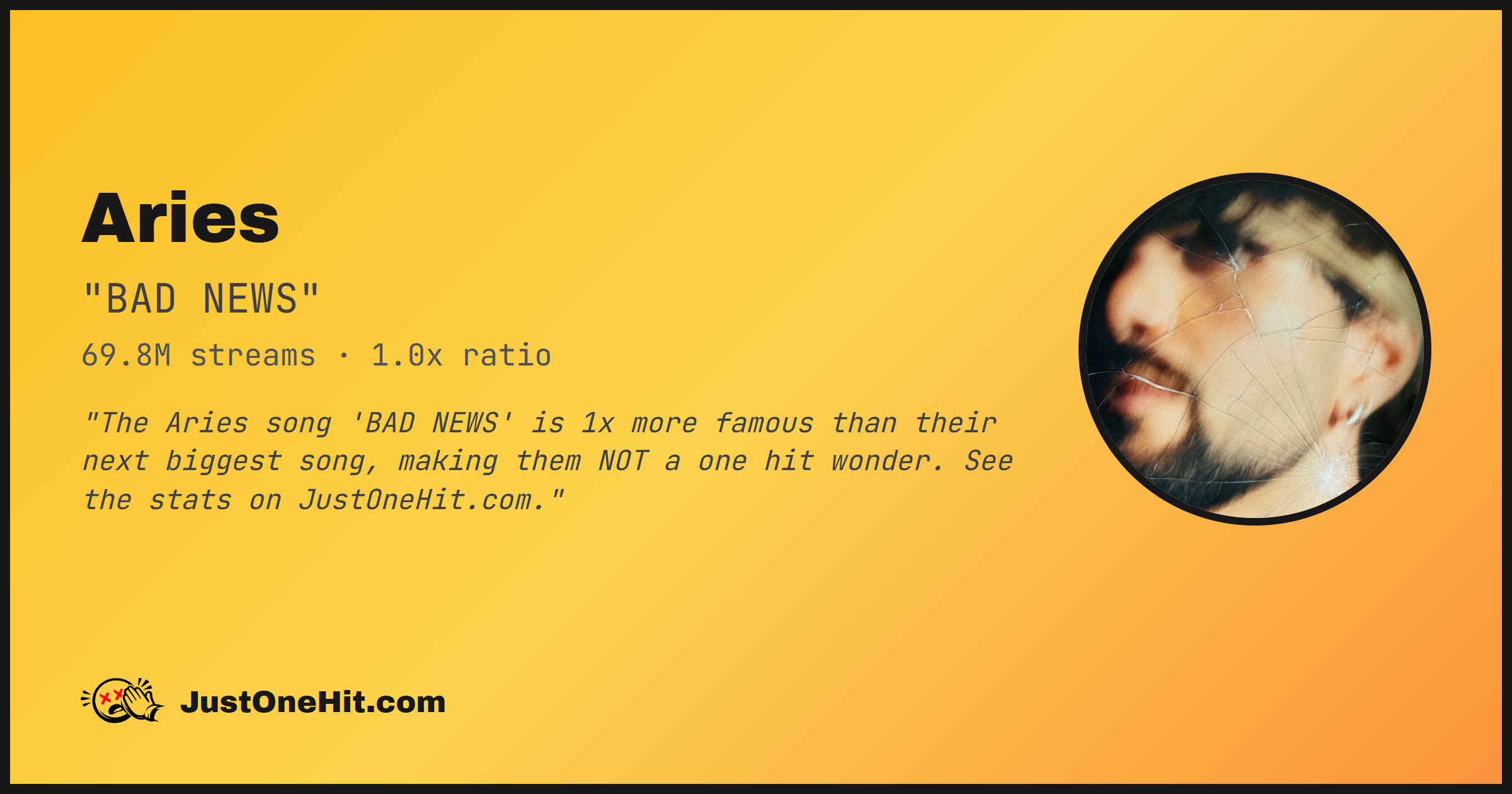 "The Aries song 'BAD NEWS' is 1x more famous than their next biggest song, making them NOT a one hit wonder. See the stats on JustOneHit.com."