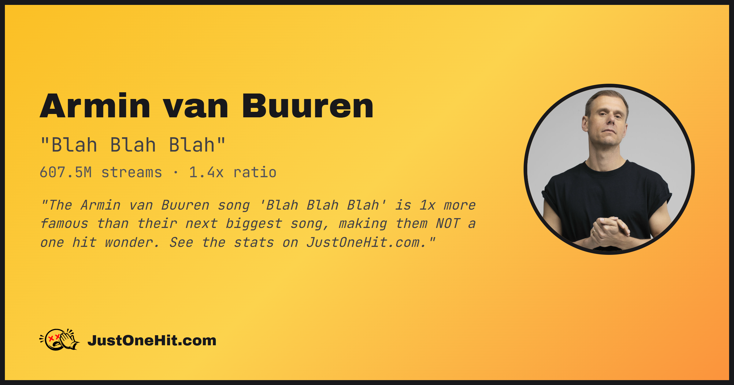 "The Armin van Buuren song 'Blah Blah Blah' is 1x more famous than their next biggest song, making them NOT a one hit wonder. See the stats on JustOneHit.com."