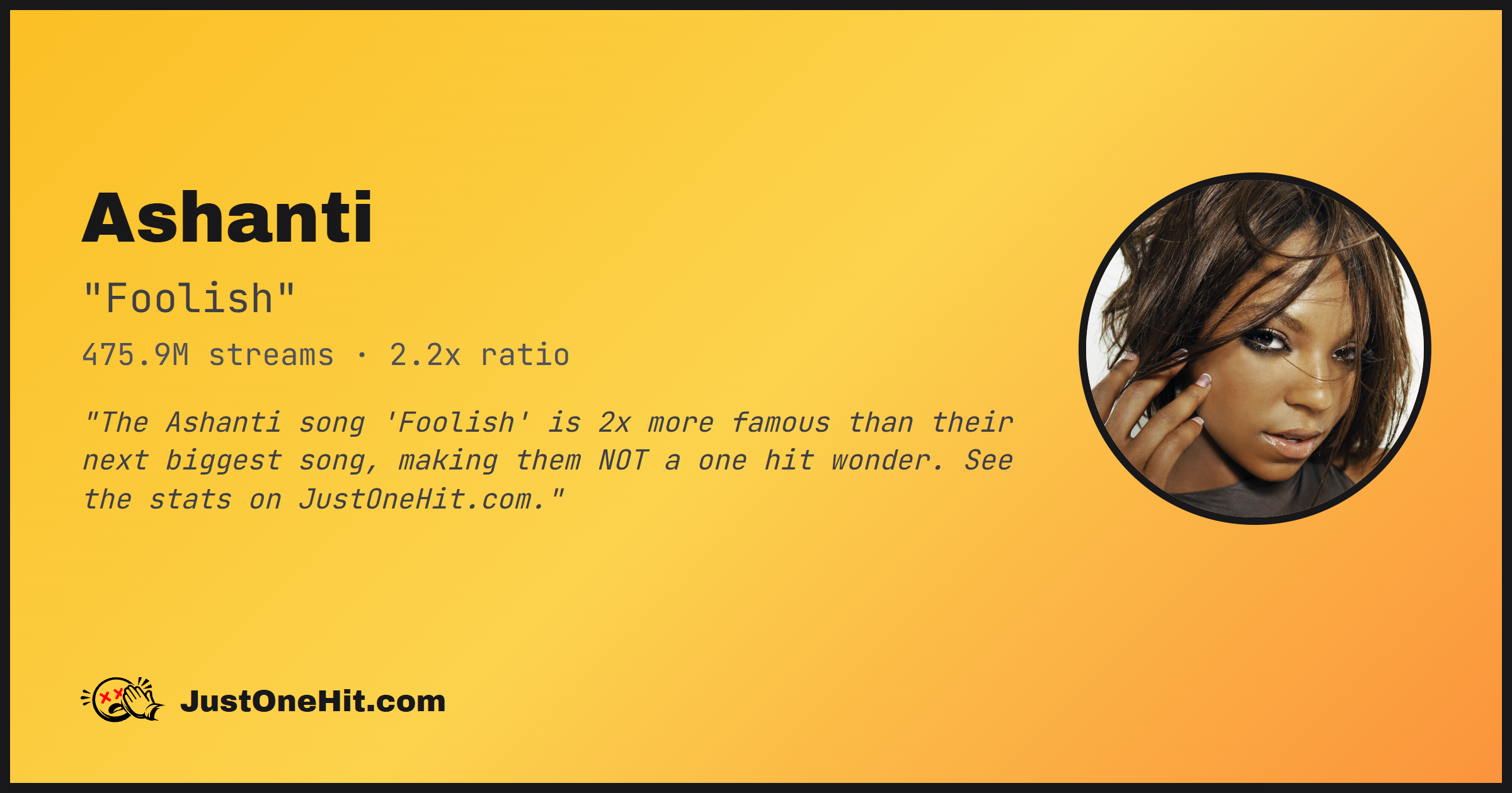"The Ashanti song 'Foolish' is 2x more famous than their next biggest song, making them NOT a one hit wonder. See the stats on JustOneHit.com."