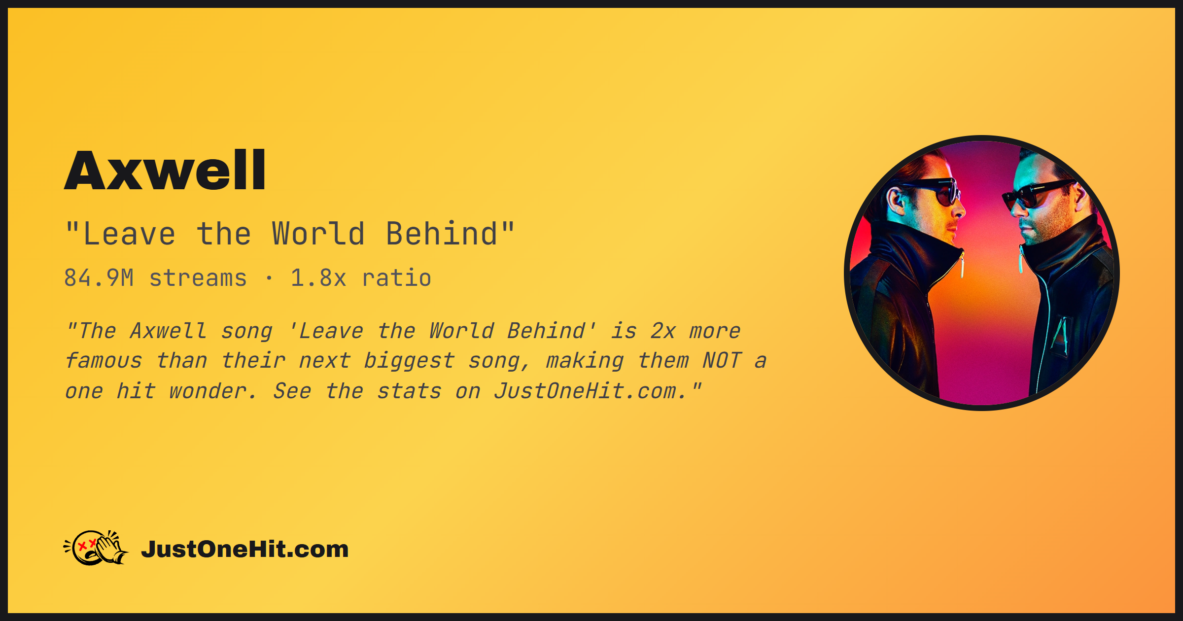 "The Axwell song 'Leave the World Behind' is 2x more famous than their next biggest song, making them NOT a one hit wonder. See the stats on JustOneHit.com."