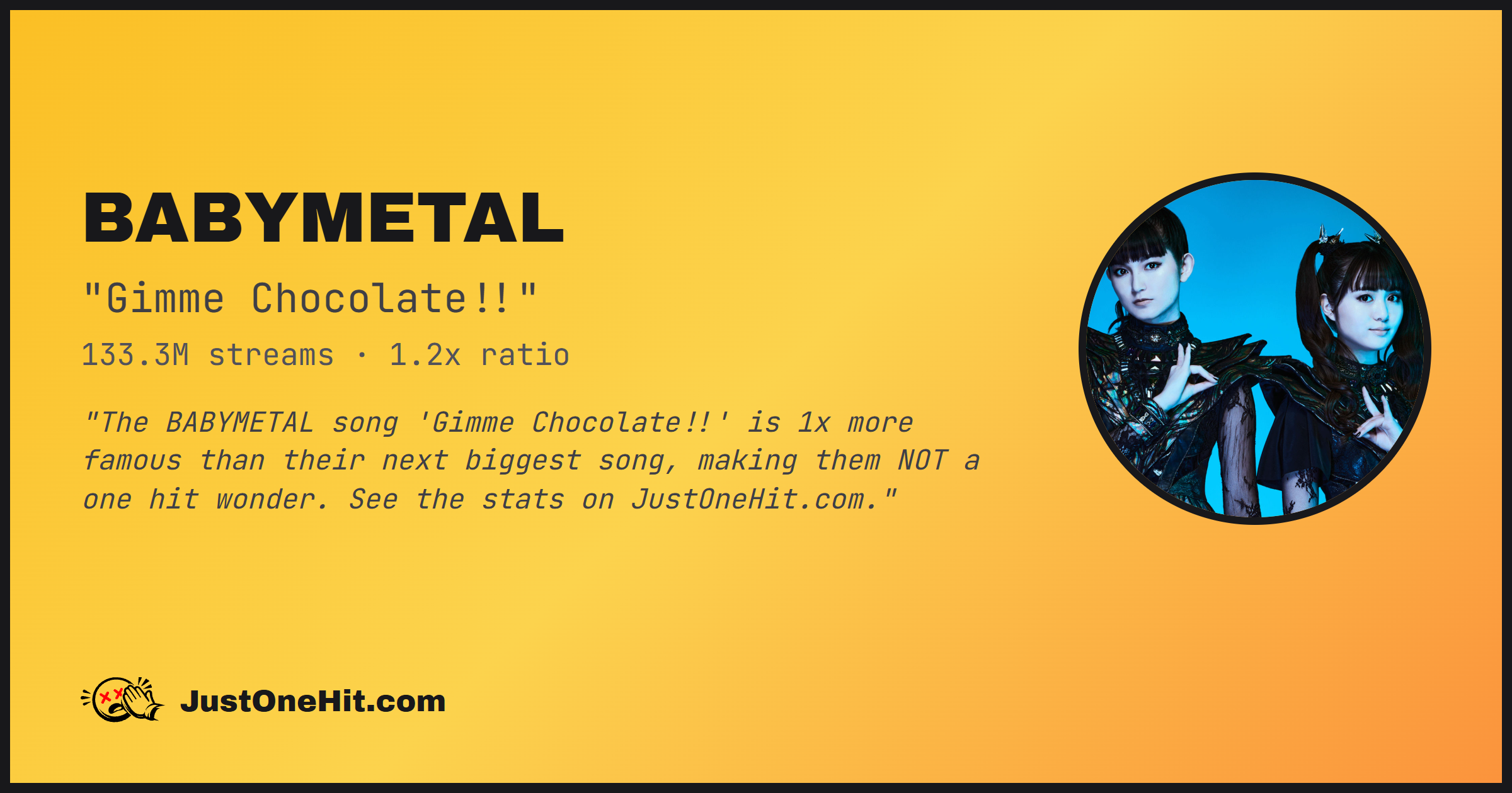"The BABYMETAL song 'Gimme Chocolate!!' is 1x more famous than their next biggest song, making them NOT a one hit wonder. See the stats on JustOneHit.com."