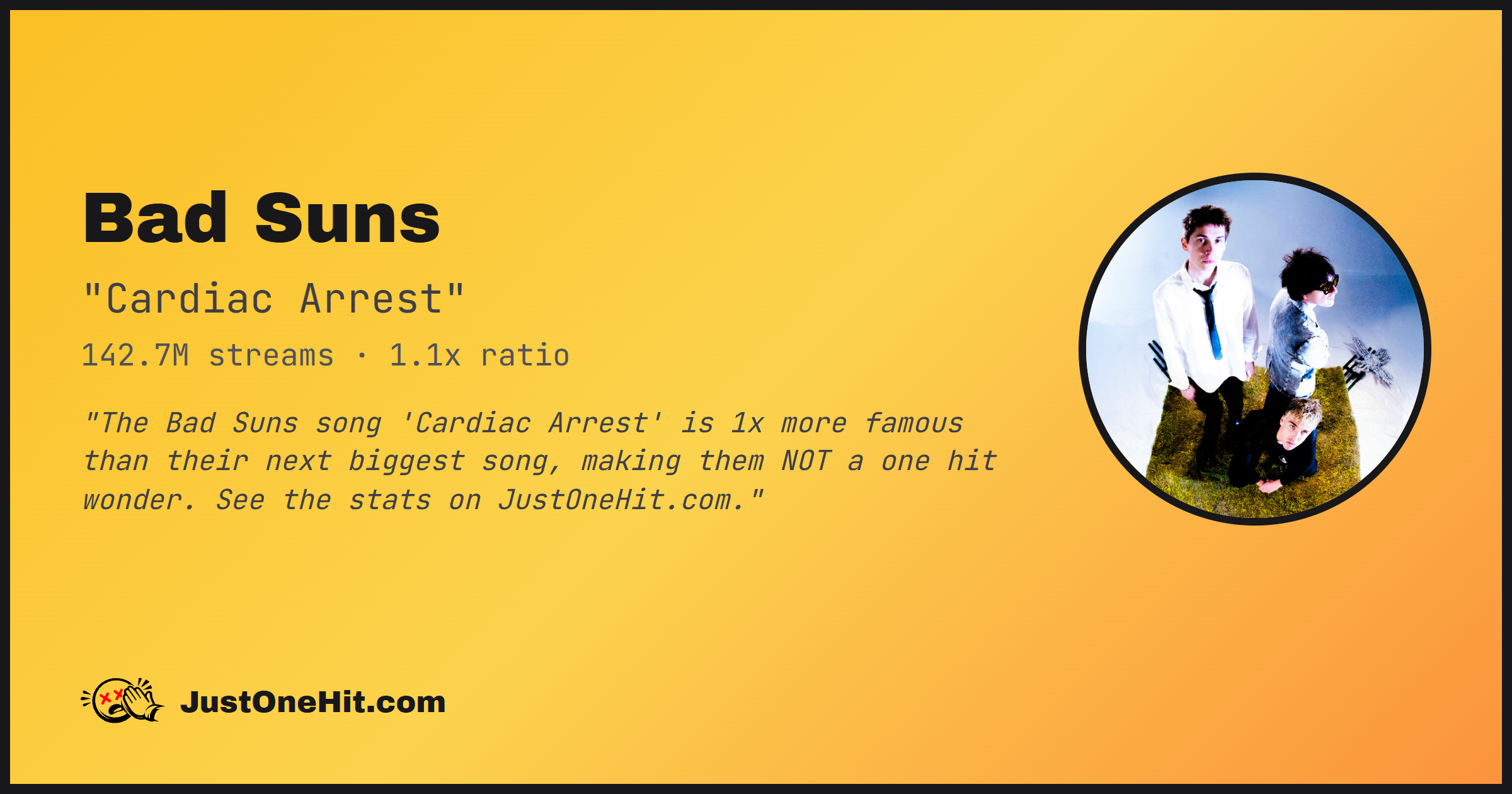 "The Bad Suns song 'Cardiac Arrest' is 1x more famous than their next biggest song, making them NOT a one hit wonder. See the stats on JustOneHit.com."