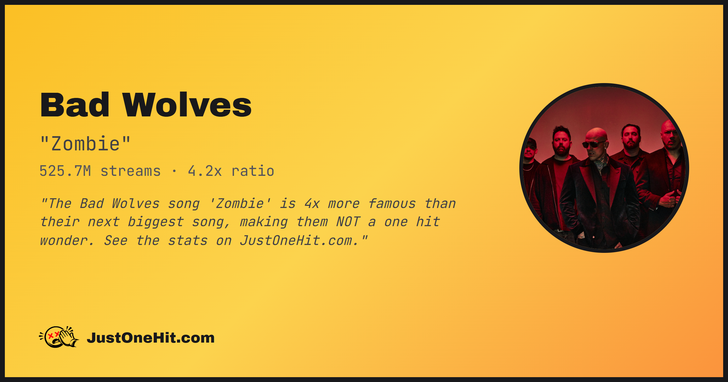 "The Bad Wolves song 'Zombie' is 4x more famous than their next biggest song, making them NOT a one hit wonder. See the stats on JustOneHit.com."