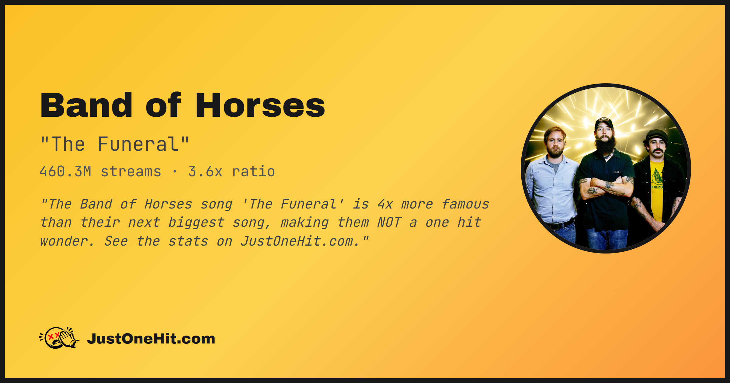 "The Band of Horses song 'The Funeral' is 4x more famous than their next biggest song, making them NOT a one hit wonder. See the stats on JustOneHit.com."