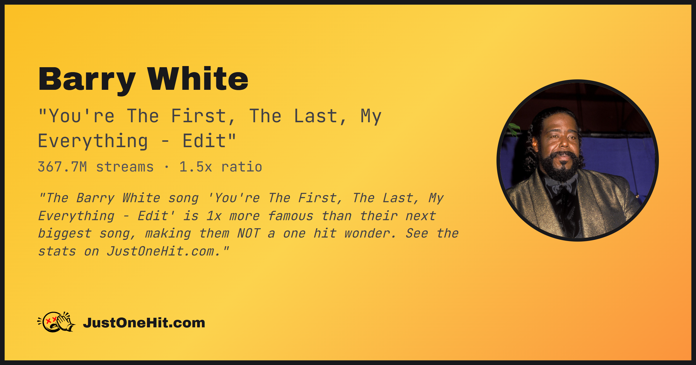 "The Barry White song 'You're The First, The Last, My Everything - Edit' is 1x more famous than their next biggest song, making them NOT a one hit wonder. See the stats on JustOneHit.com."