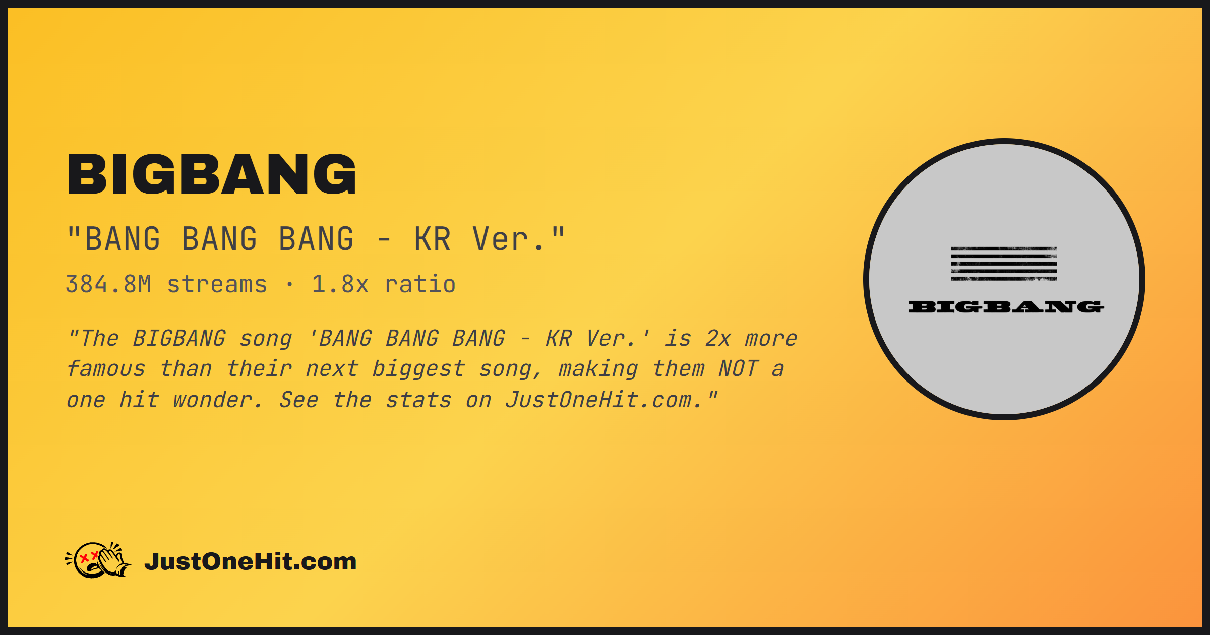 "The BIGBANG song 'BANG BANG BANG - KR Ver.' is 2x more famous than their next biggest song, making them NOT a one hit wonder. See the stats on JustOneHit.com."