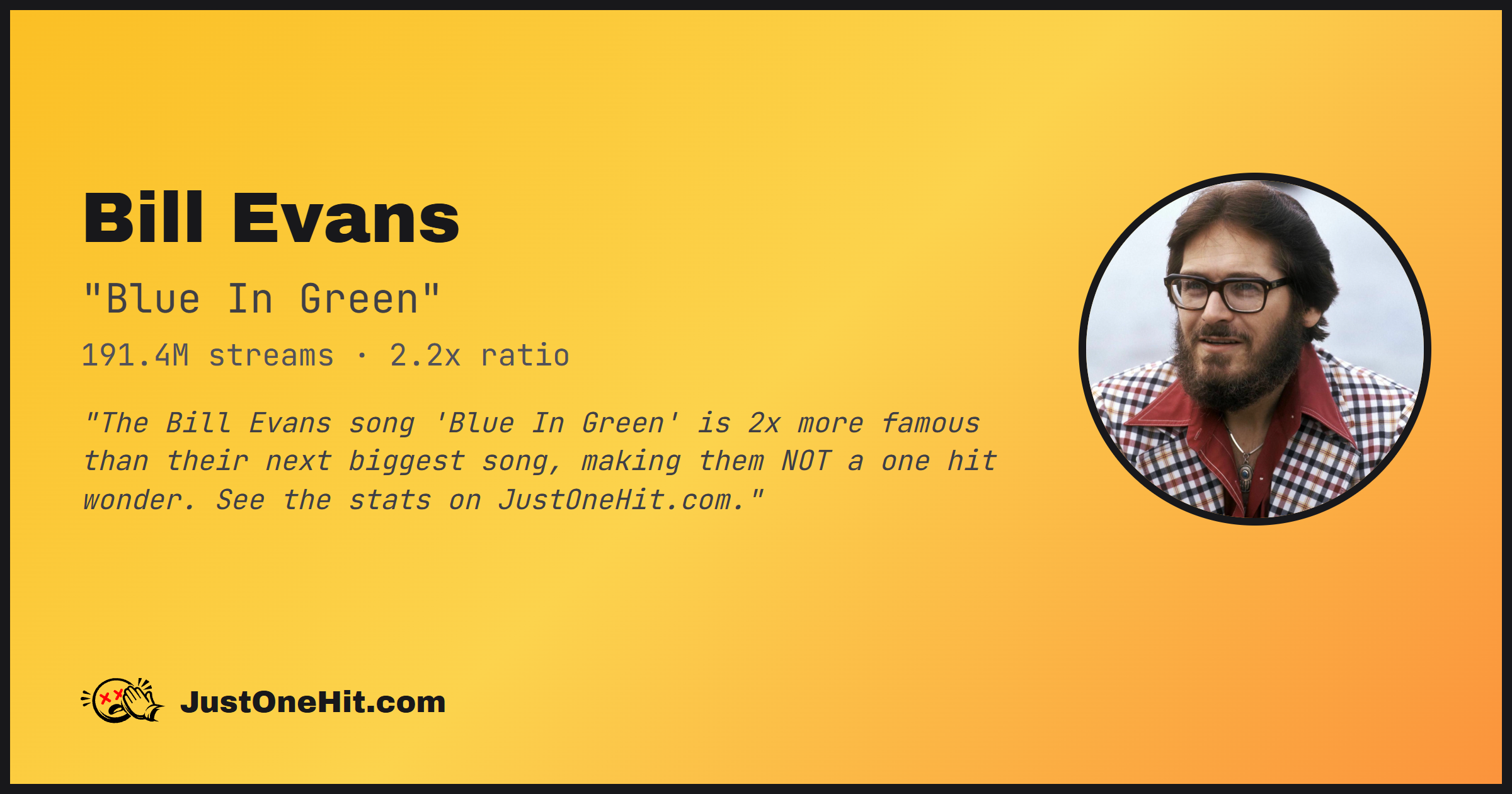 "The Bill Evans song 'Blue In Green' is 2x more famous than their next biggest song, making them NOT a one hit wonder. See the stats on JustOneHit.com."