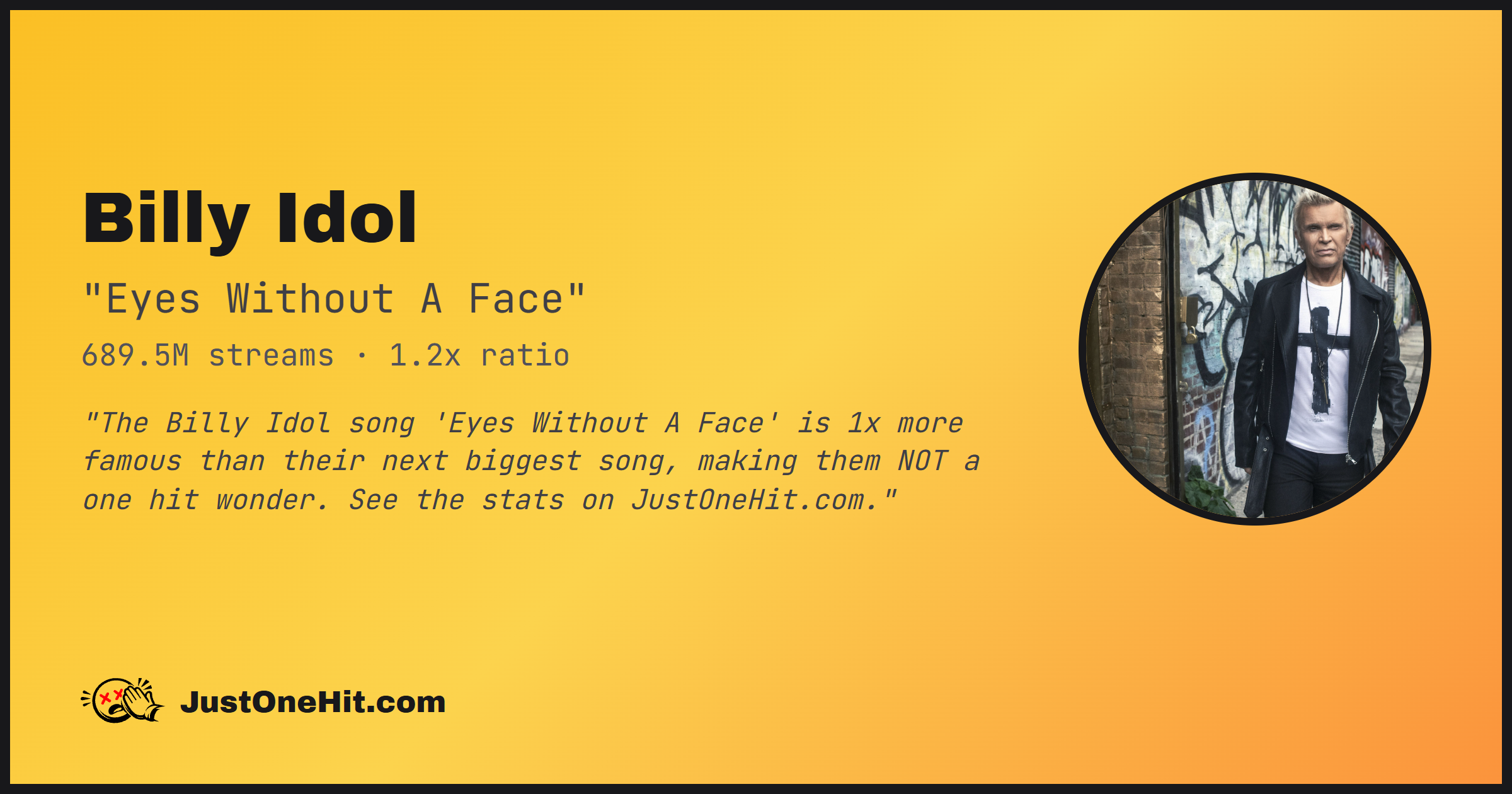 "The Billy Idol song 'Eyes Without A Face' is 1x more famous than their next biggest song, making them NOT a one hit wonder. See the stats on JustOneHit.com."