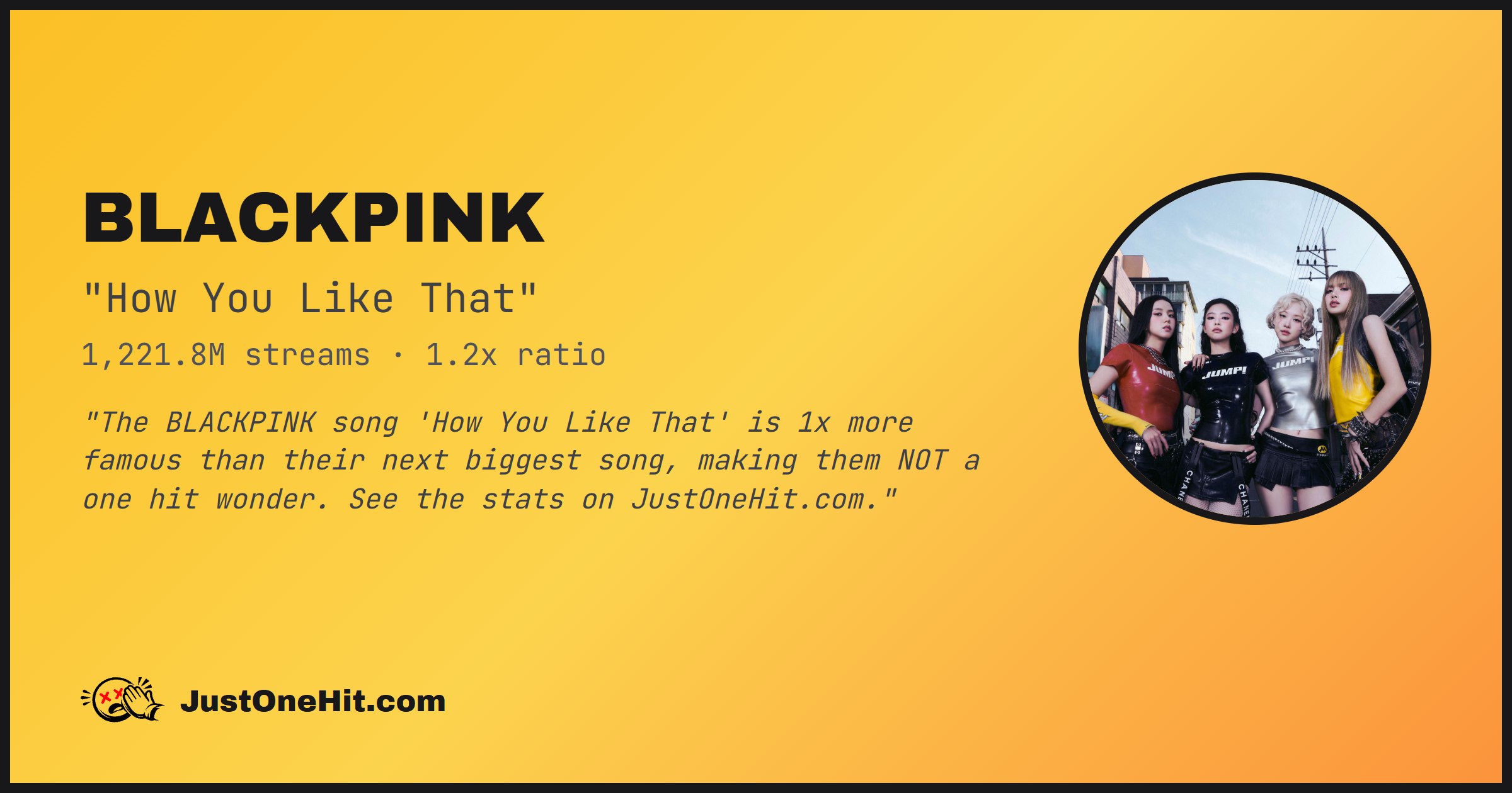"The BLACKPINK song 'How You Like That' is 1x more famous than their next biggest song, making them NOT a one hit wonder. See the stats on JustOneHit.com."