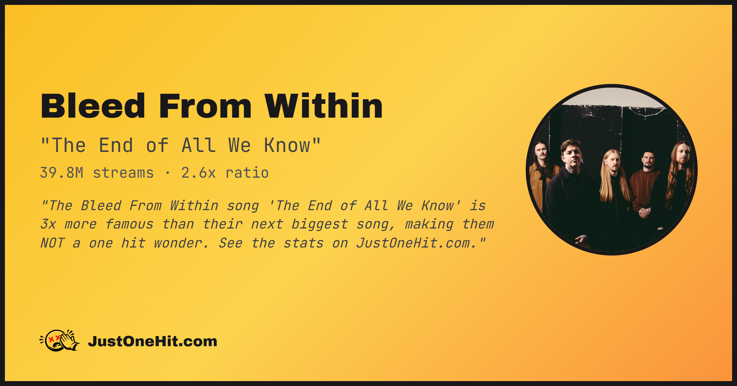 "The Bleed From Within song 'The End of All We Know' is 3x more famous than their next biggest song, making them NOT a one hit wonder. See the stats on JustOneHit.com."