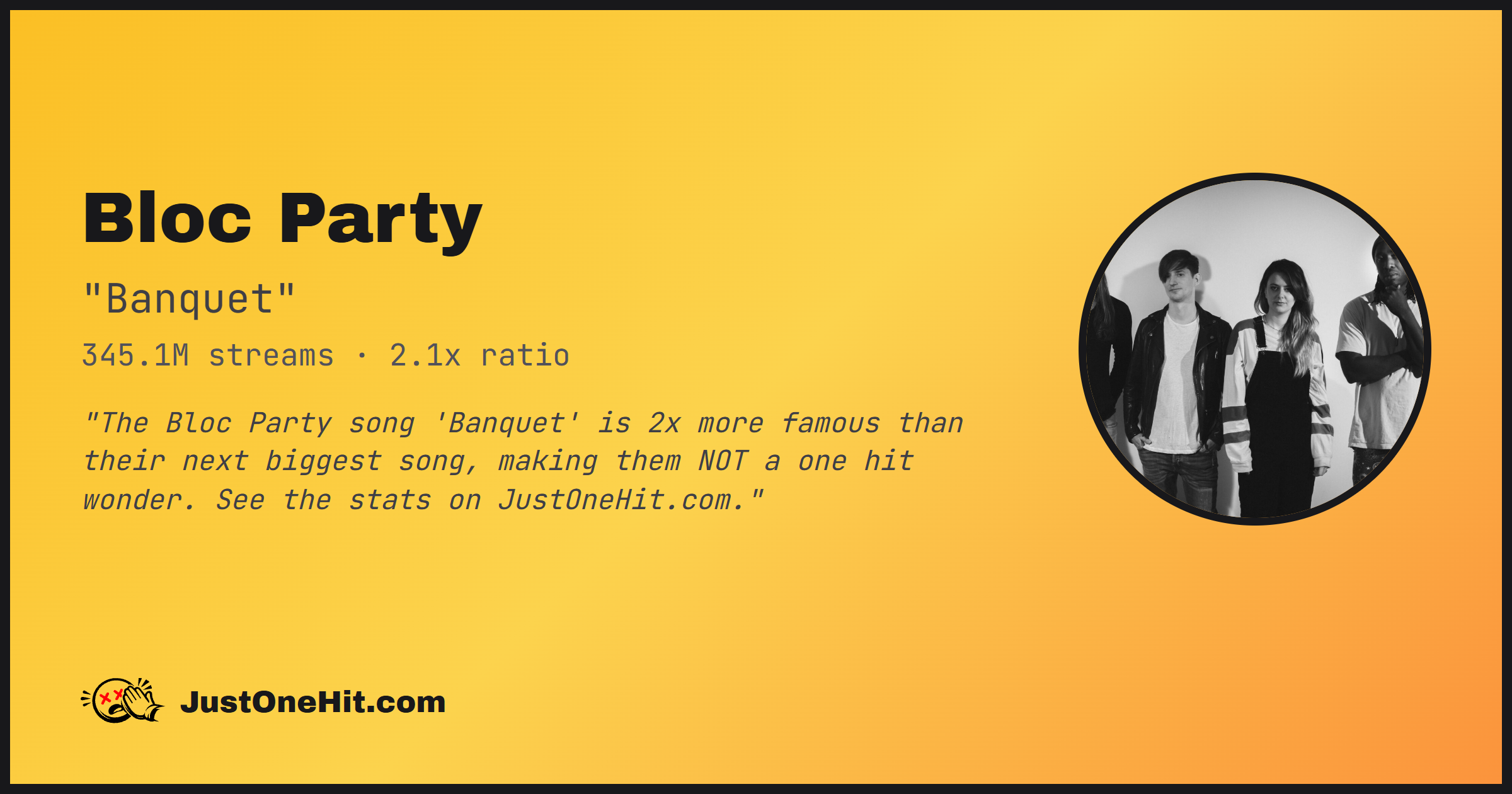 "The Bloc Party song 'Banquet' is 2x more famous than their next biggest song, making them NOT a one hit wonder. See the stats on JustOneHit.com."