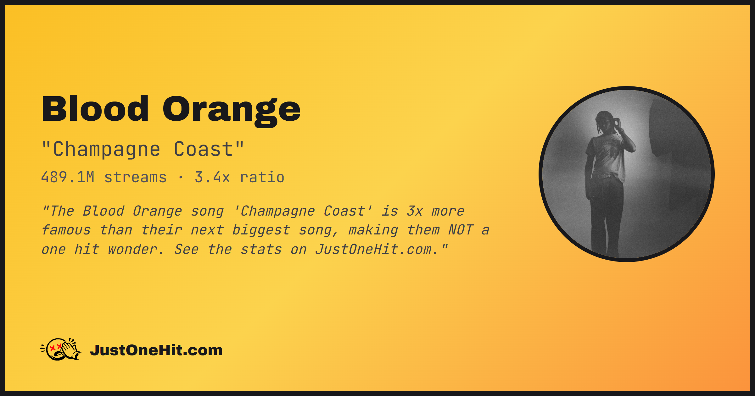 "The Blood Orange song 'Champagne Coast' is 4x more famous than their next biggest song, making them NOT a one hit wonder. See the stats on JustOneHit.com."