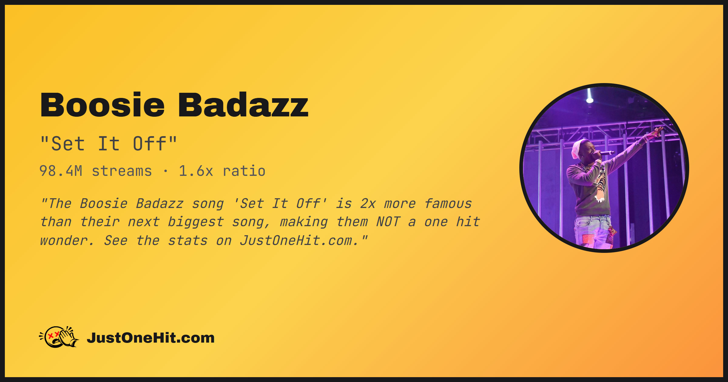 "The Boosie Badazz song 'Set It Off' is 2x more famous than their next biggest song, making them NOT a one hit wonder. See the stats on JustOneHit.com."