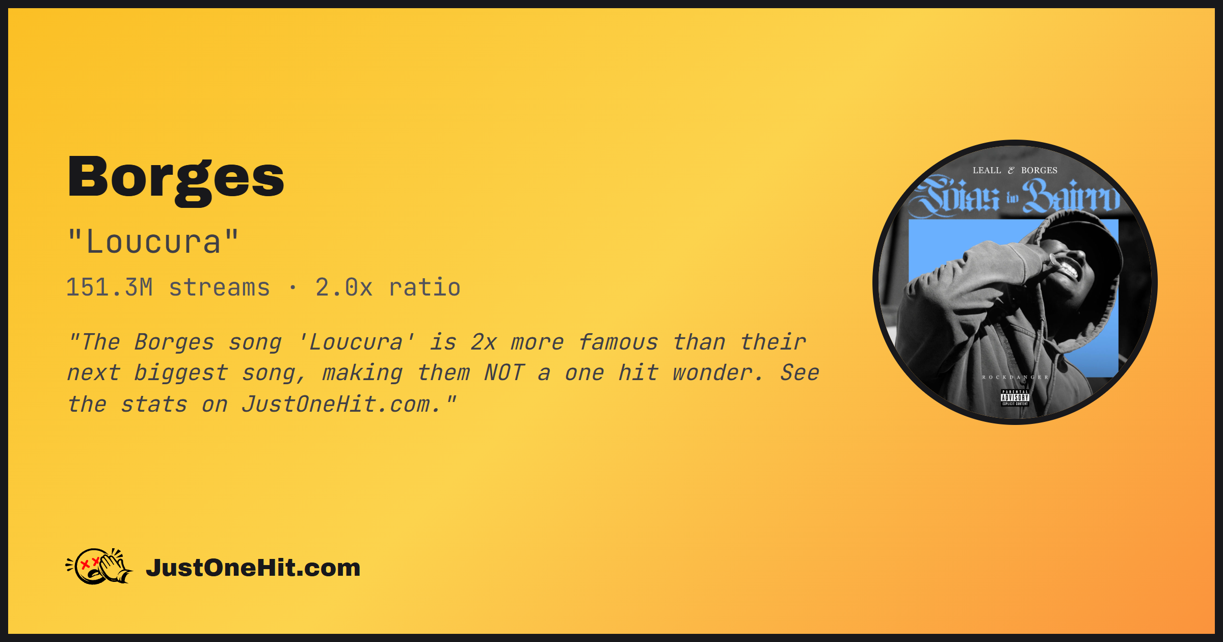 "The Borges song 'Loucura' is 2x more famous than their next biggest song, making them NOT a one hit wonder. See the stats on JustOneHit.com."