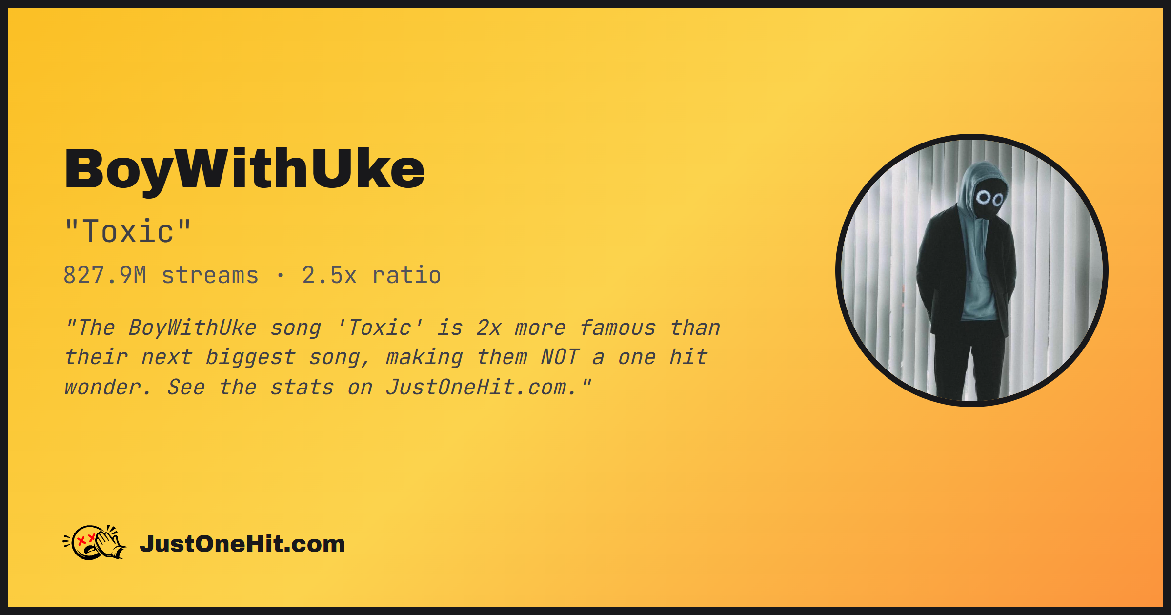 "The BoyWithUke song 'Toxic' is 2x more famous than their next biggest song, making them NOT a one hit wonder. See the stats on JustOneHit.com."