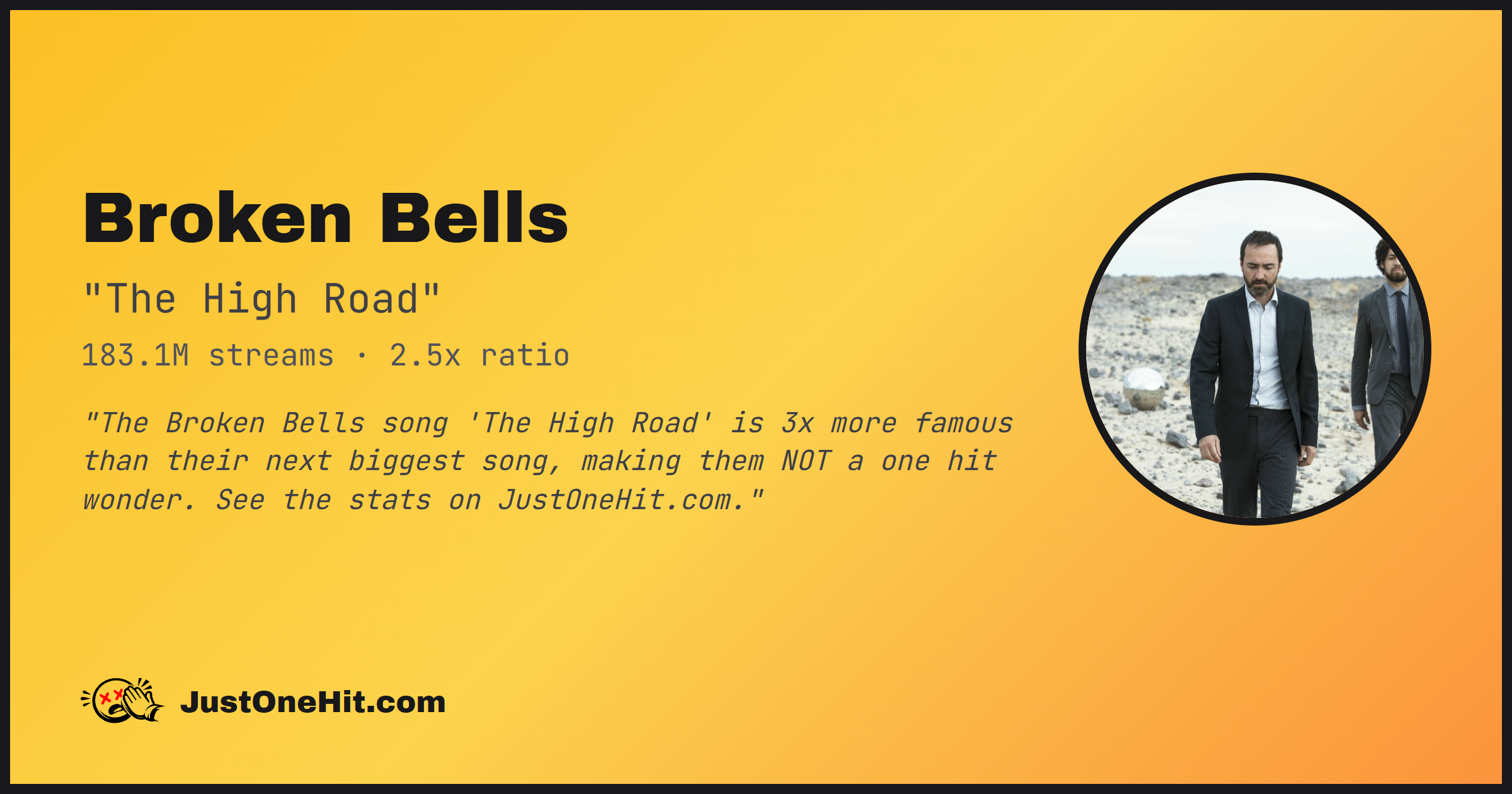 "The Broken Bells song 'The High Road' is 3x more famous than their next biggest song, making them NOT a one hit wonder. See the stats on JustOneHit.com."