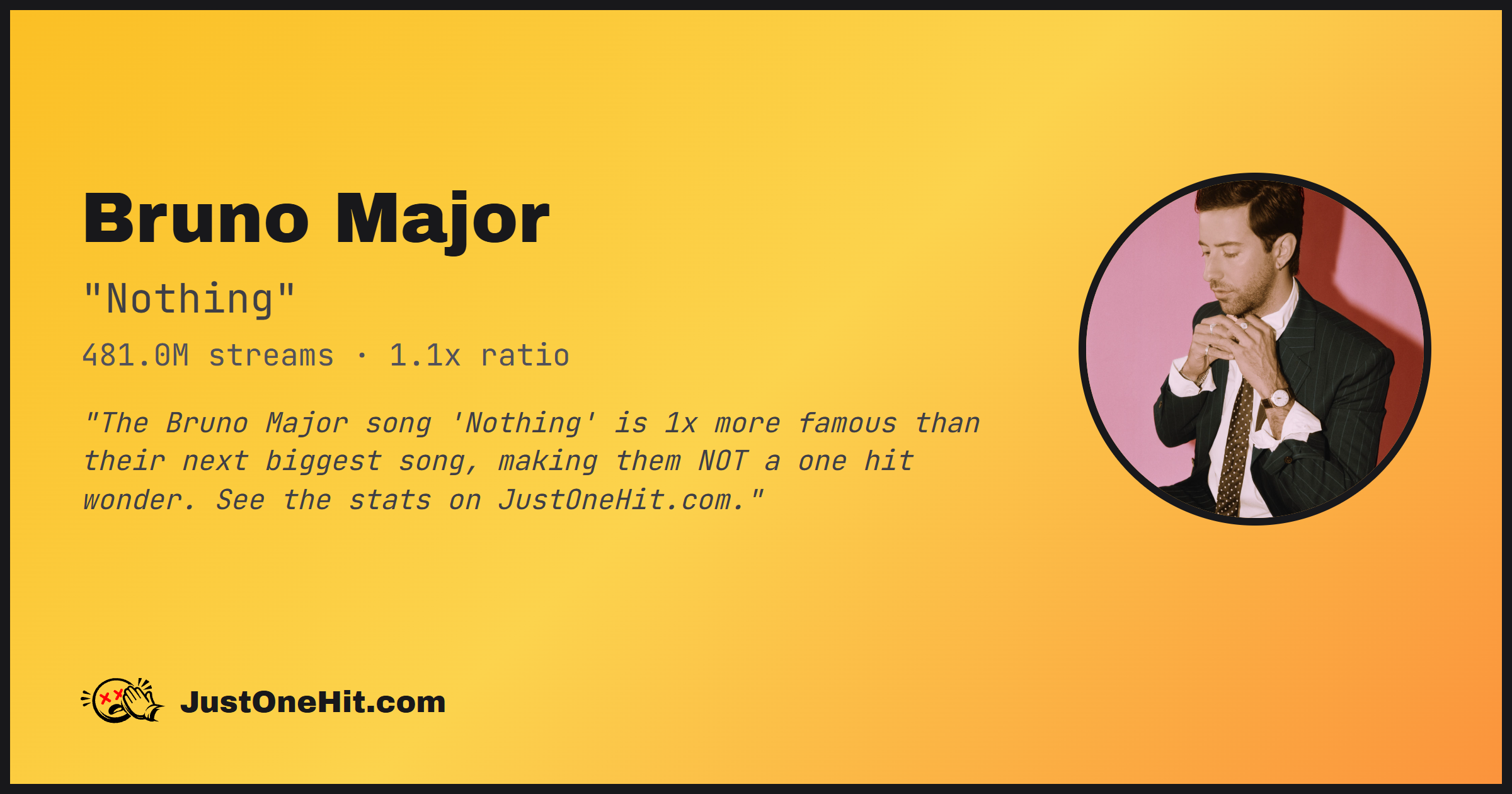 "The Bruno Major song 'Nothing' is 1x more famous than their next biggest song, making them NOT a one hit wonder. See the stats on JustOneHit.com."