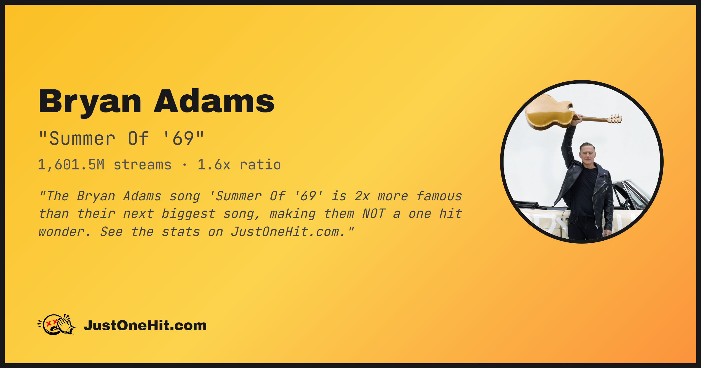 "The Bryan Adams song 'Summer Of '69' is 2x more famous than their next biggest song, making them NOT a one hit wonder. See the stats on JustOneHit.com."