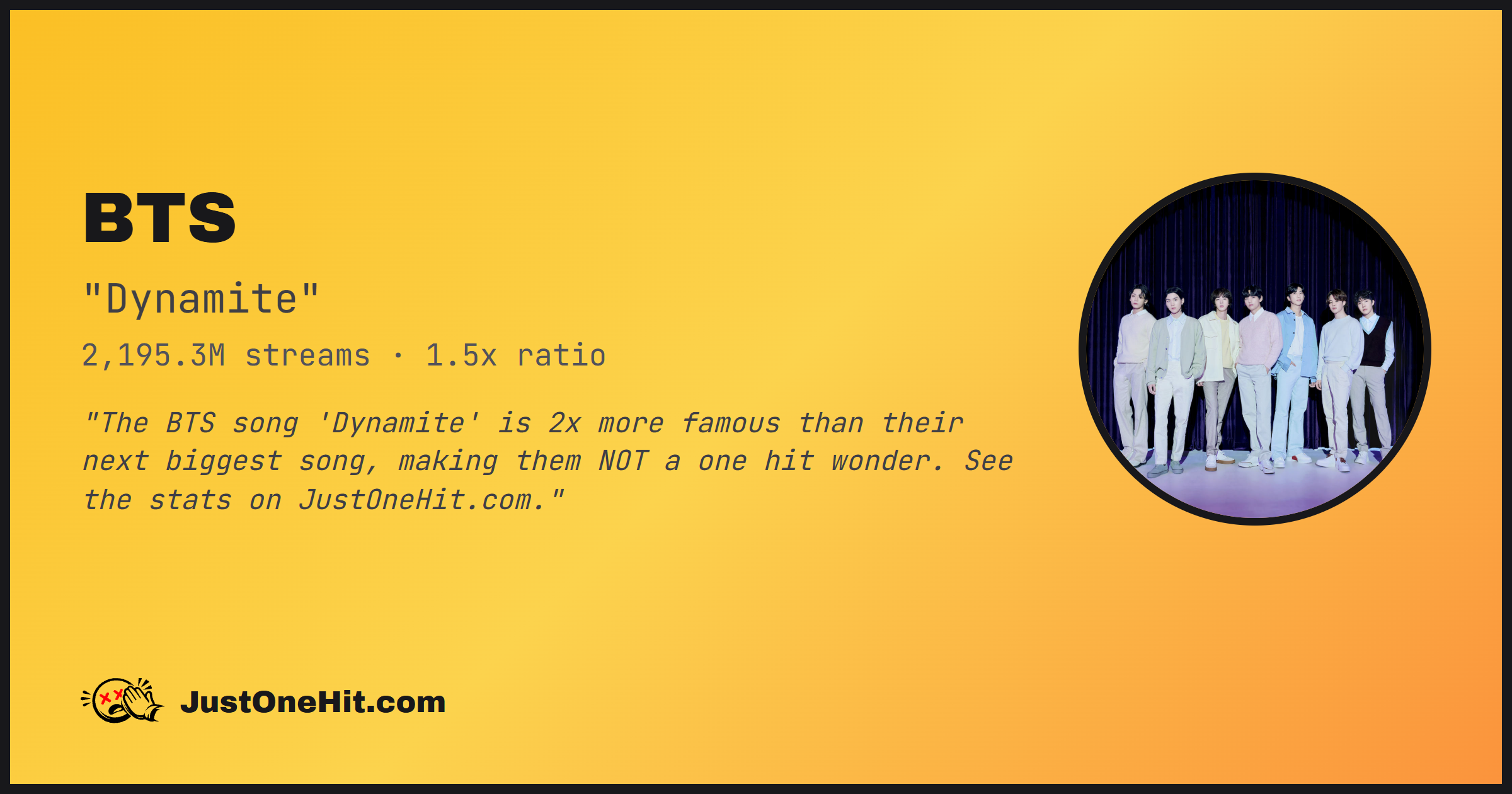 "The BTS song 'Dynamite' is 2x more famous than their next biggest song, making them NOT a one hit wonder. See the stats on JustOneHit.com."