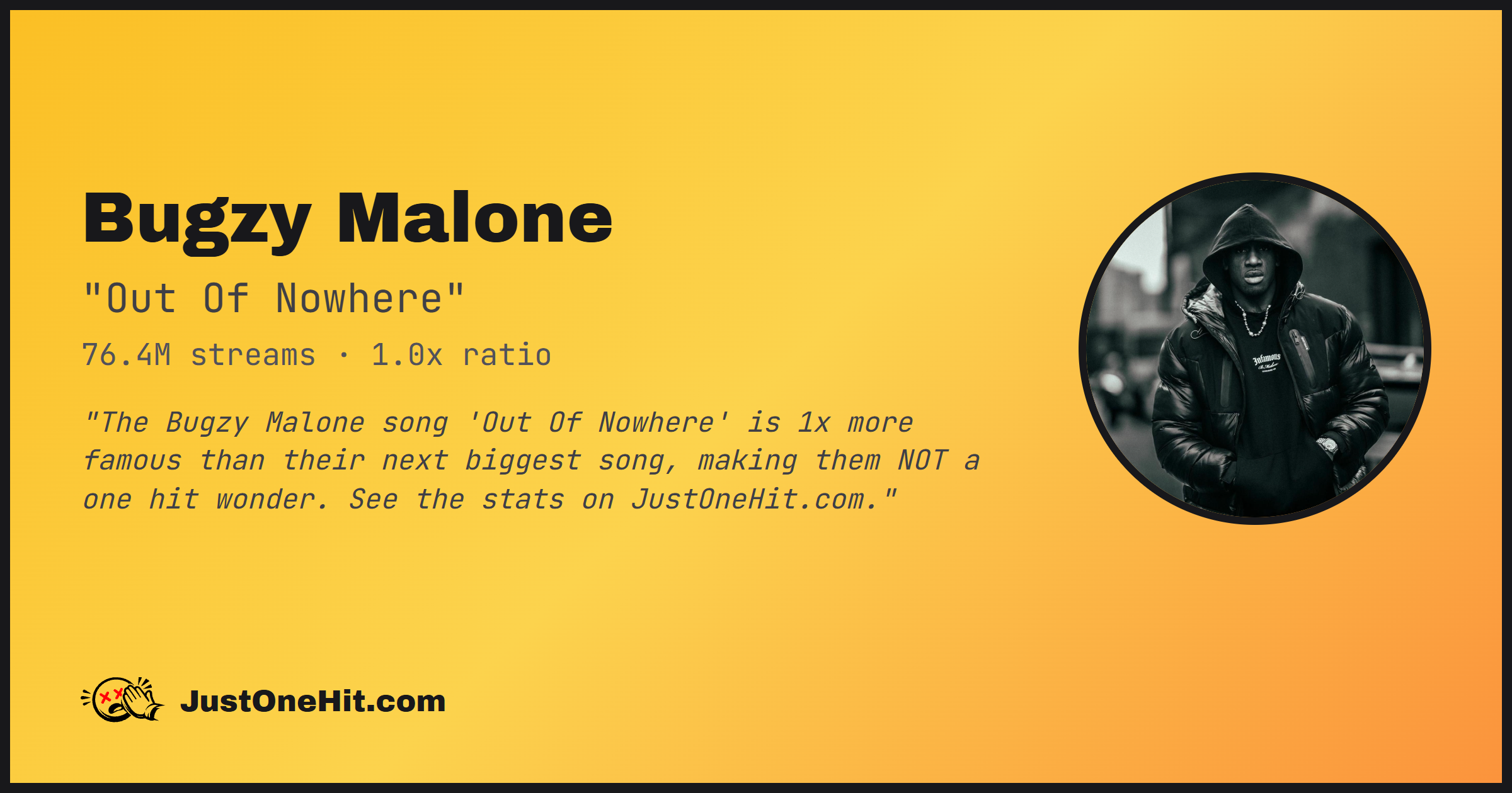 "The Bugzy Malone song 'Out Of Nowhere' is 1x more famous than their next biggest song, making them NOT a one hit wonder. See the stats on JustOneHit.com."