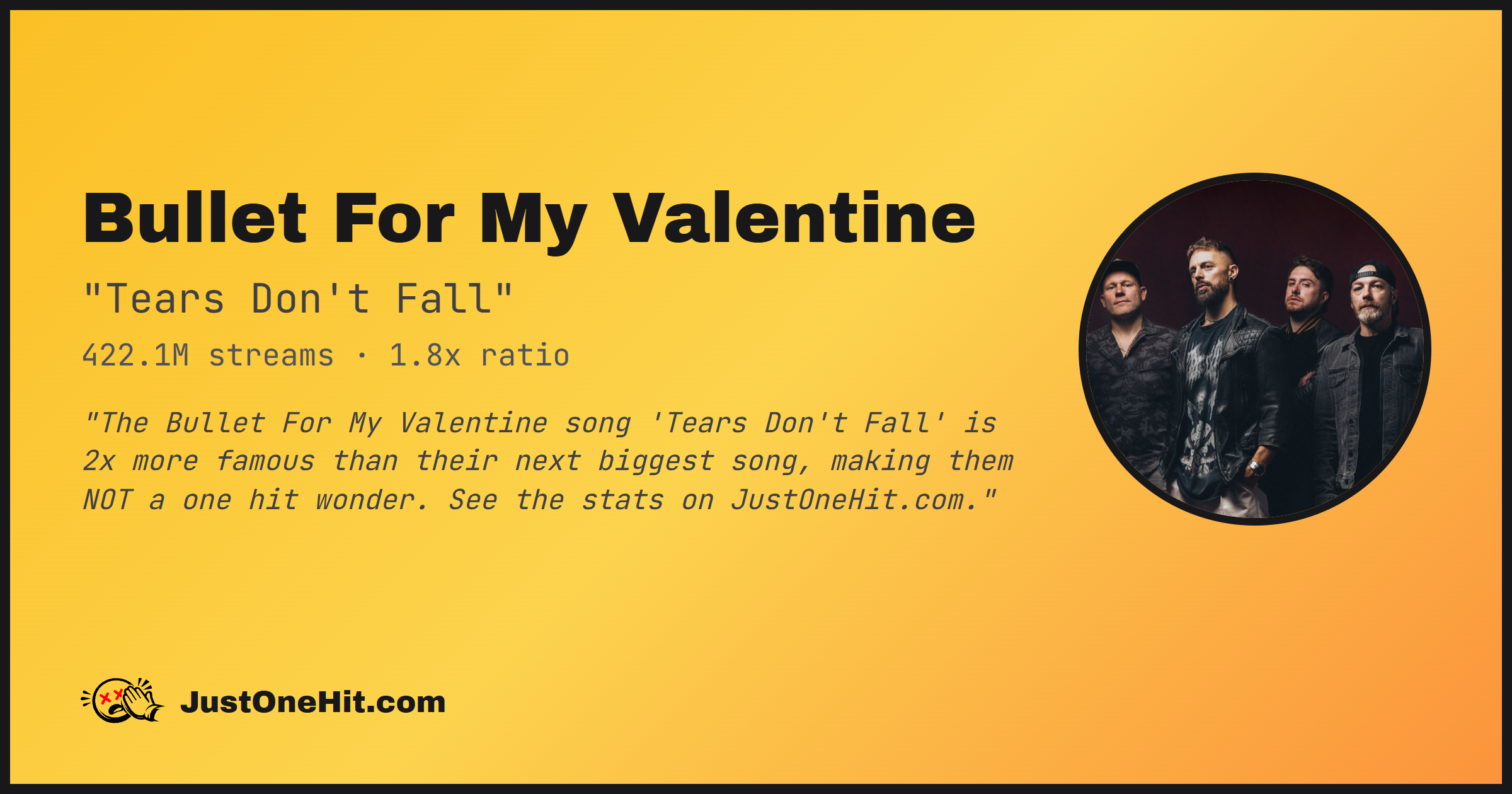 "The Bullet For My Valentine song 'Tears Don't Fall' is 2x more famous than their next biggest song, making them NOT a one hit wonder. See the stats on JustOneHit.com."
