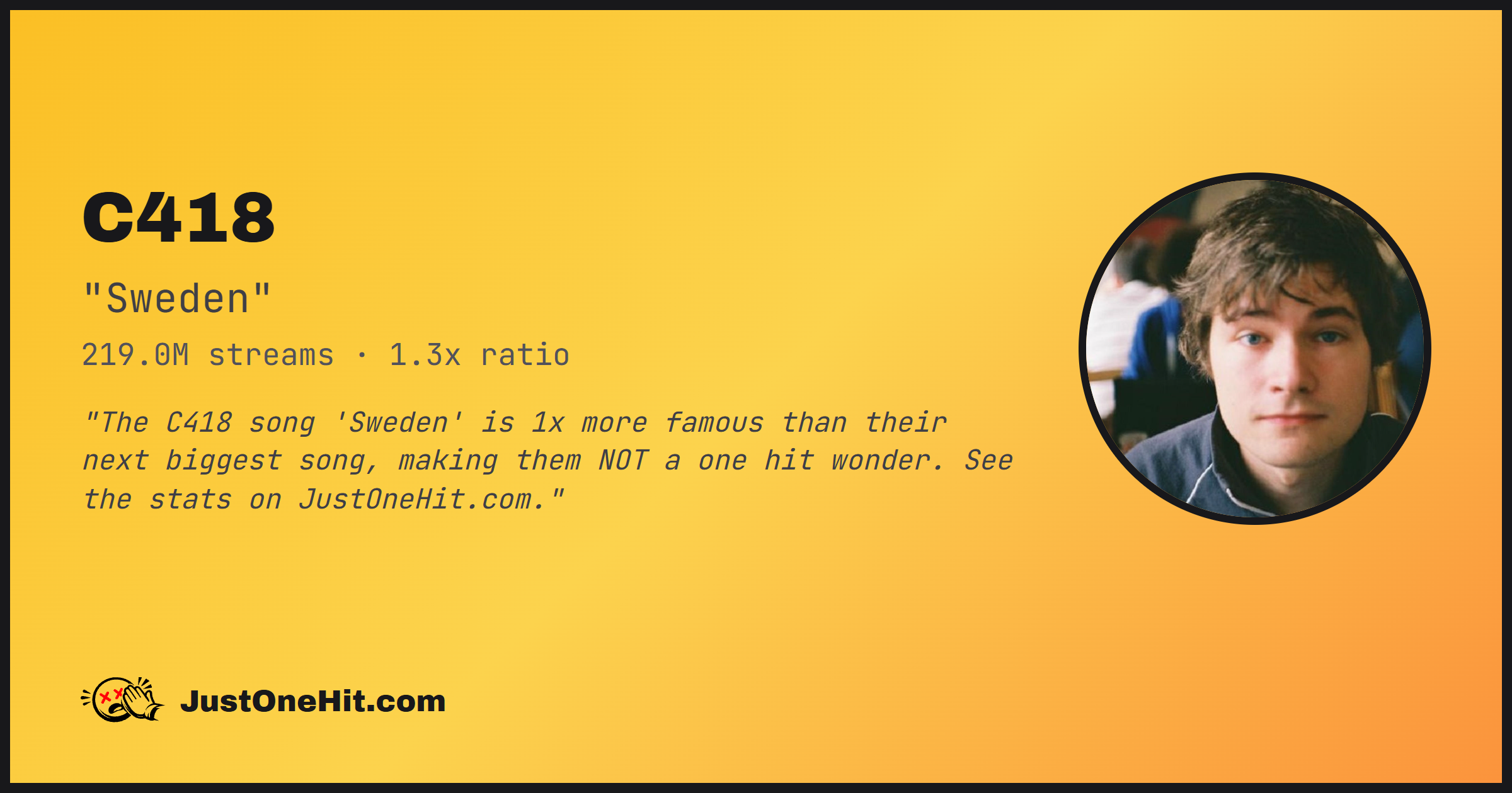 "The C418 song 'Sweden' is 1x more famous than their next biggest song, making them NOT a one hit wonder. See the stats on JustOneHit.com."
