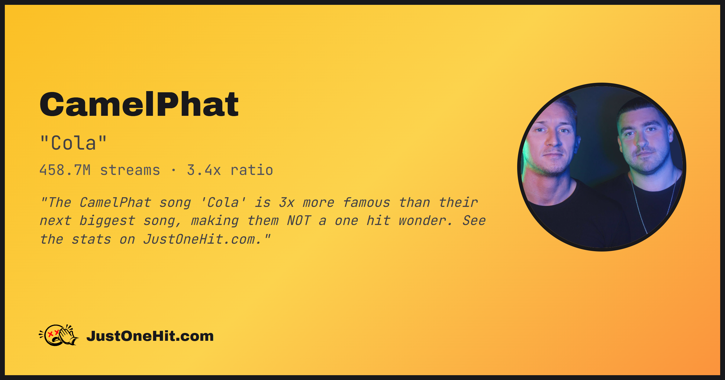 "The CamelPhat song 'Cola' is 3x more famous than their next biggest song, making them NOT a one hit wonder. See the stats on JustOneHit.com."