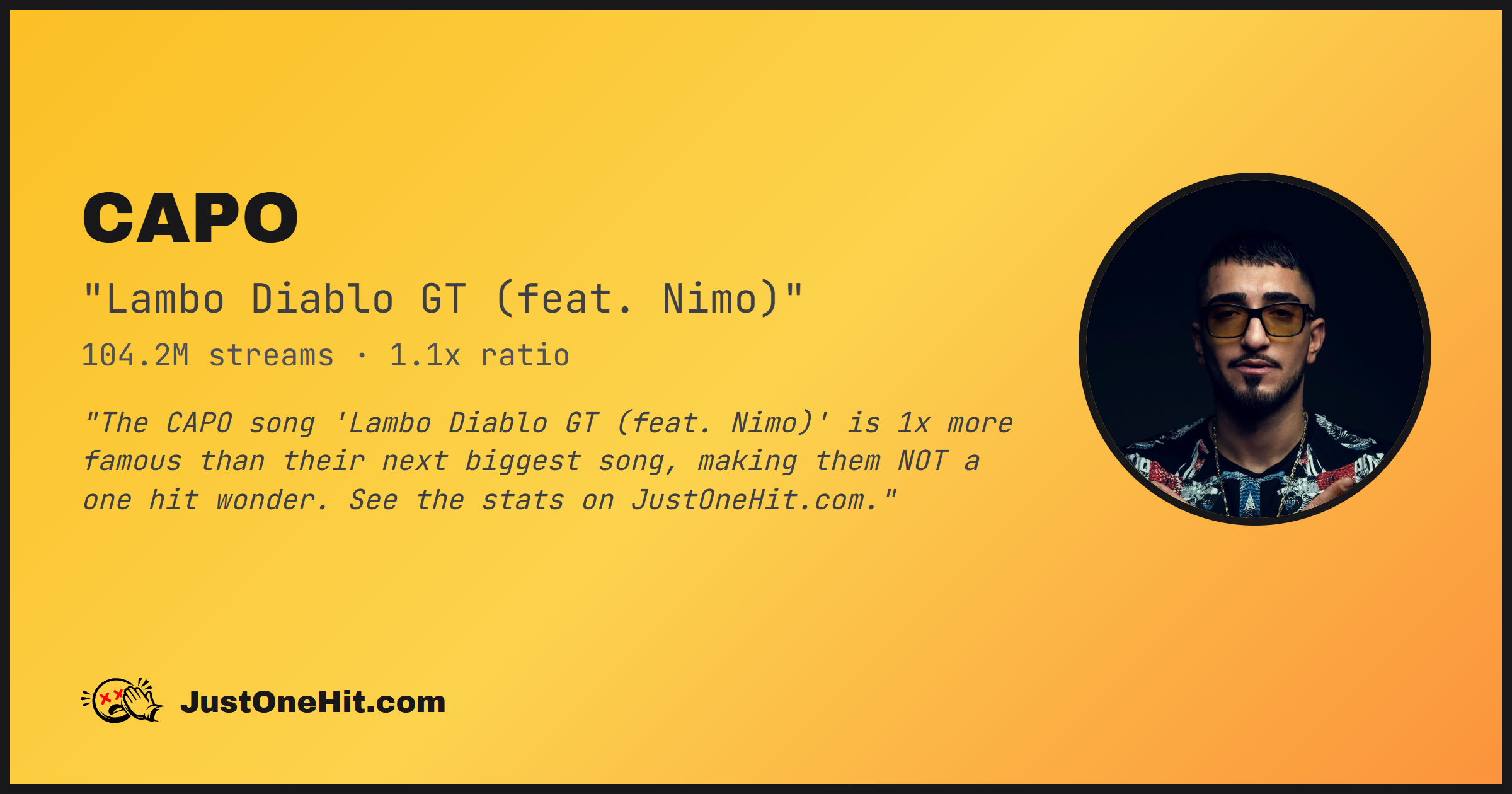 "The CAPO song 'Lambo Diablo GT (feat. Nimo)' is 1x more famous than their next biggest song, making them NOT a one hit wonder. See the stats on JustOneHit.com."