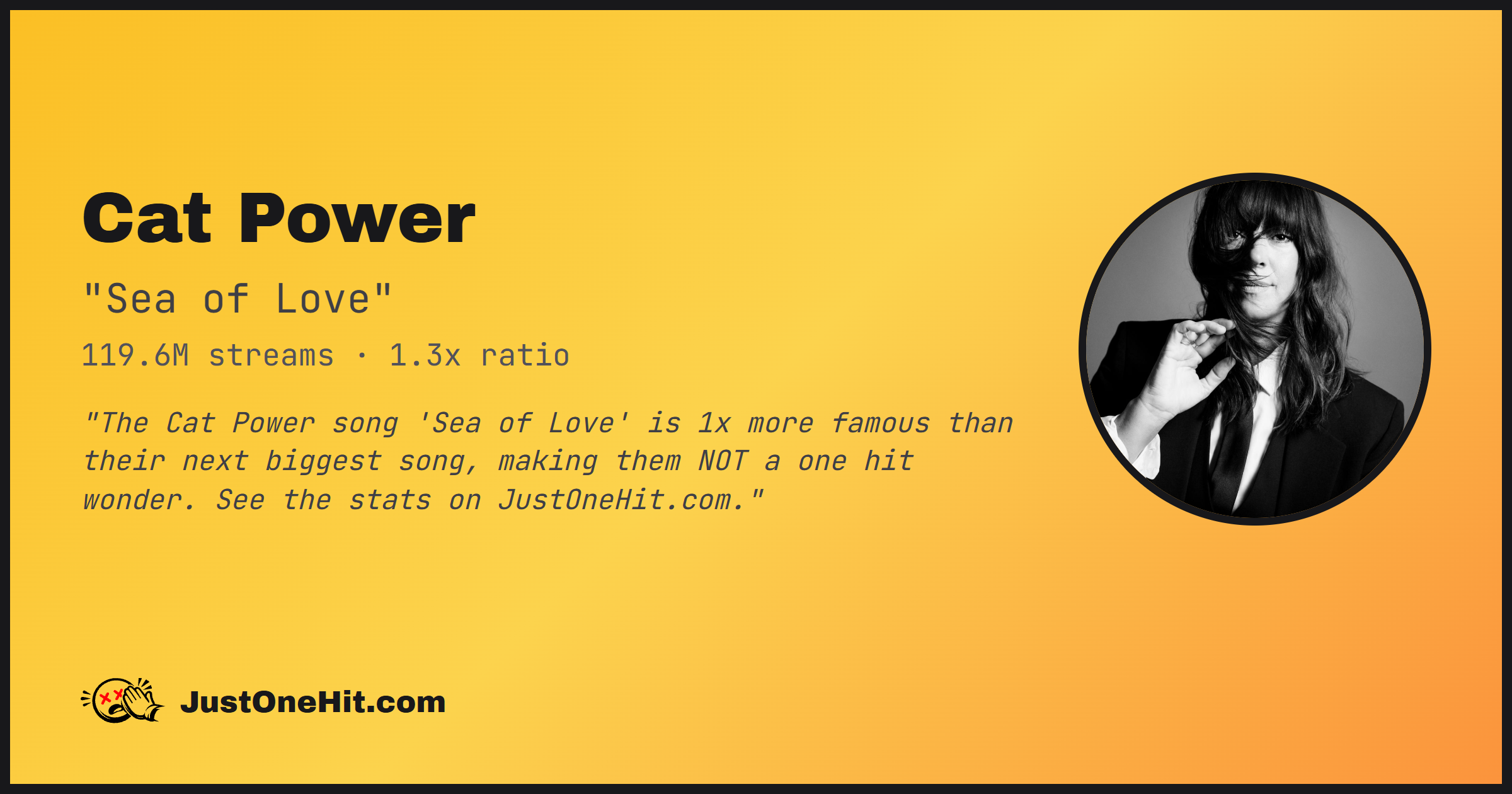 "The Cat Power song 'Sea of Love' is 1x more famous than their next biggest song, making them NOT a one hit wonder. See the stats on JustOneHit.com."
