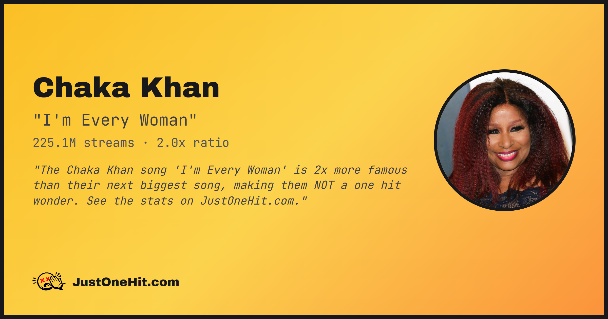 "The Chaka Khan song 'I'm Every Woman' is 2x more famous than their next biggest song, making them NOT a one hit wonder. See the stats on JustOneHit.com."