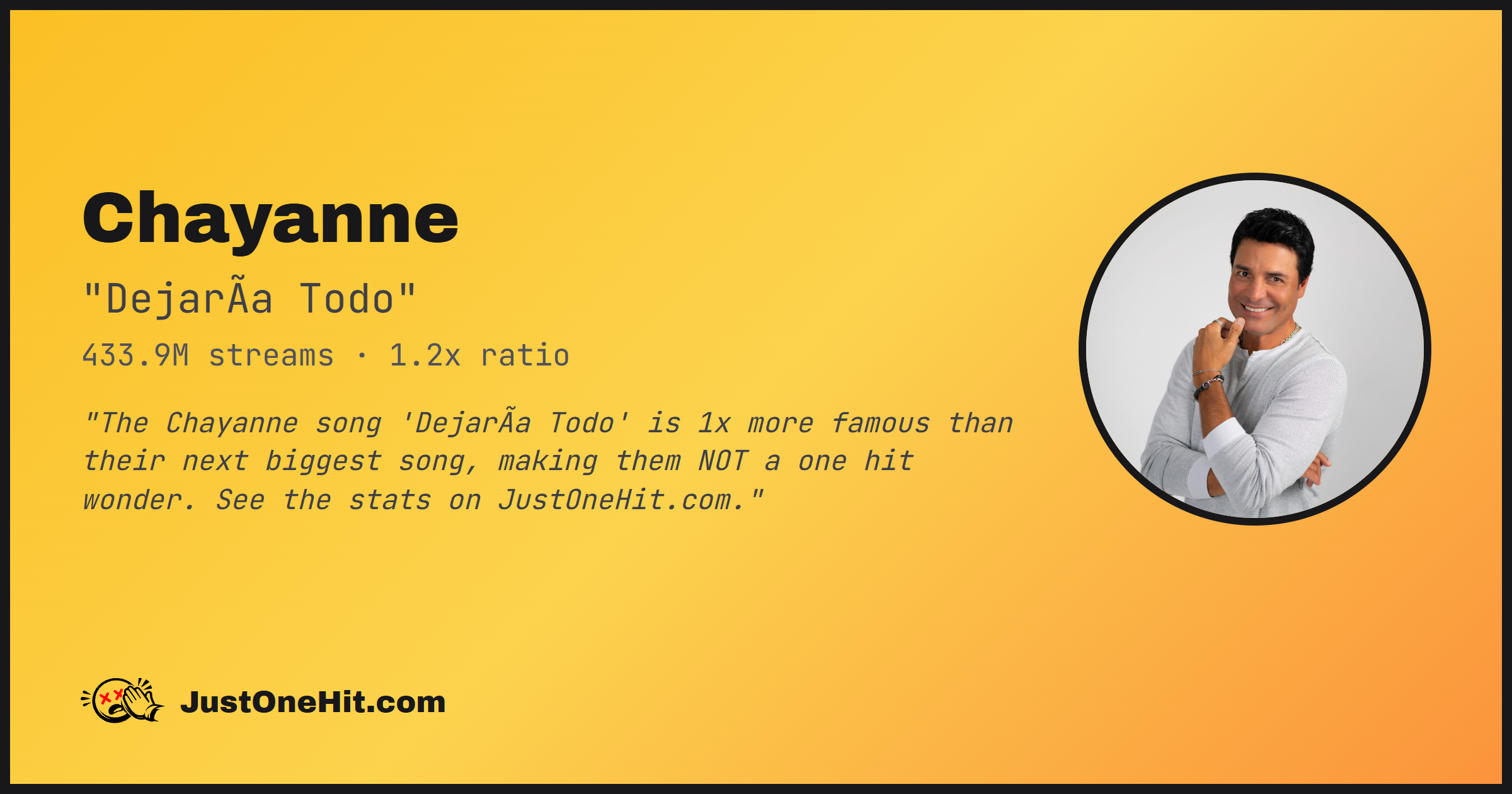 "The Chayanne song 'DejarÃa Todo' is 1x more famous than their next biggest song, making them NOT a one hit wonder. See the stats on JustOneHit.com."